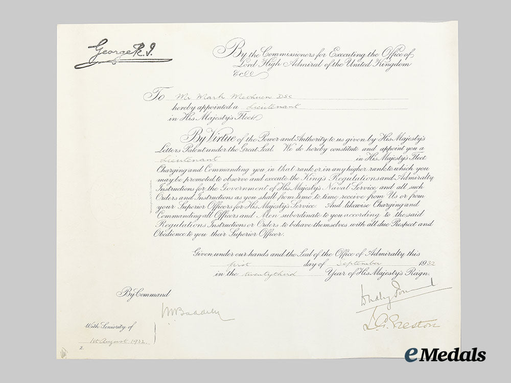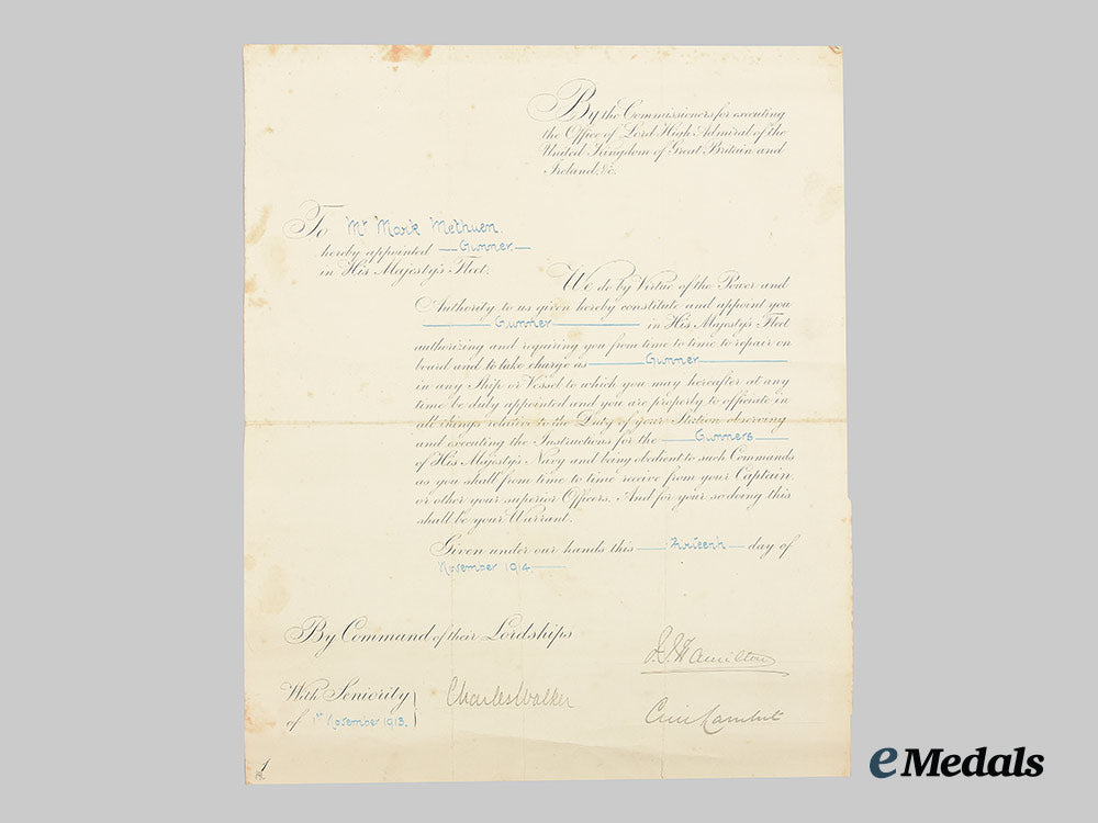 An Original Commission Document Appointing Methuen to be a Gunner, composed of paper, dated November 13 1914, measuring 304mm (w) x 365mm (h), lightly soiled, heavily creased horizontally through center and vertically along the left side, better than fine condition. An Original Commission Document Appointing Methuen to be a Commissioned Gunner, composed of paper, dated November 29, 1923, measures 357mm (w) x 306mm (h), embossed on top left corner, watermark along right side, contained in cardboard cylinder, very fine condition. An Original Commission Document Appointing Methuen, DSC to Lieutenant of the Royal Fleet, composed of paper dated September 1, 1932, measures 355mm (w) x 301mm (h), embossed along left side, contained in cardboard cylinder, very fine condition.