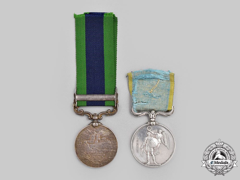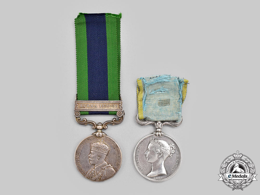 2. India General Service Medal 1908-1935, to Special Constable Maung Tha Nge Gale, Volunteer Force: 1 Clasp - BURMA 1930-32 (SPL. CONST. MAUNG THA NGE GALE, VOL. FORCE). In silver, measuring 36 mm in diameter, edge nicks, replacement ribbon. Very fine and near extremely fine, respectively.