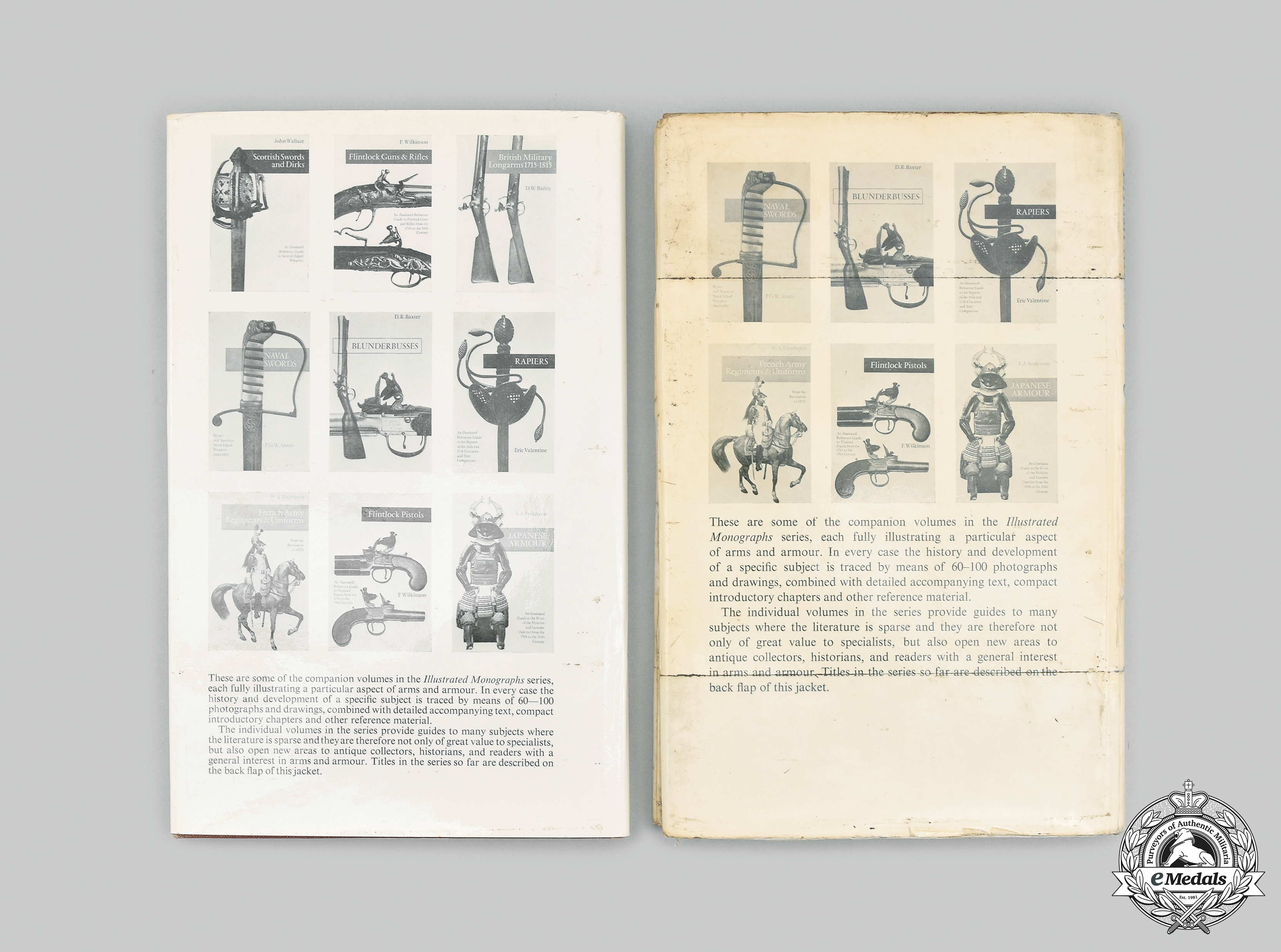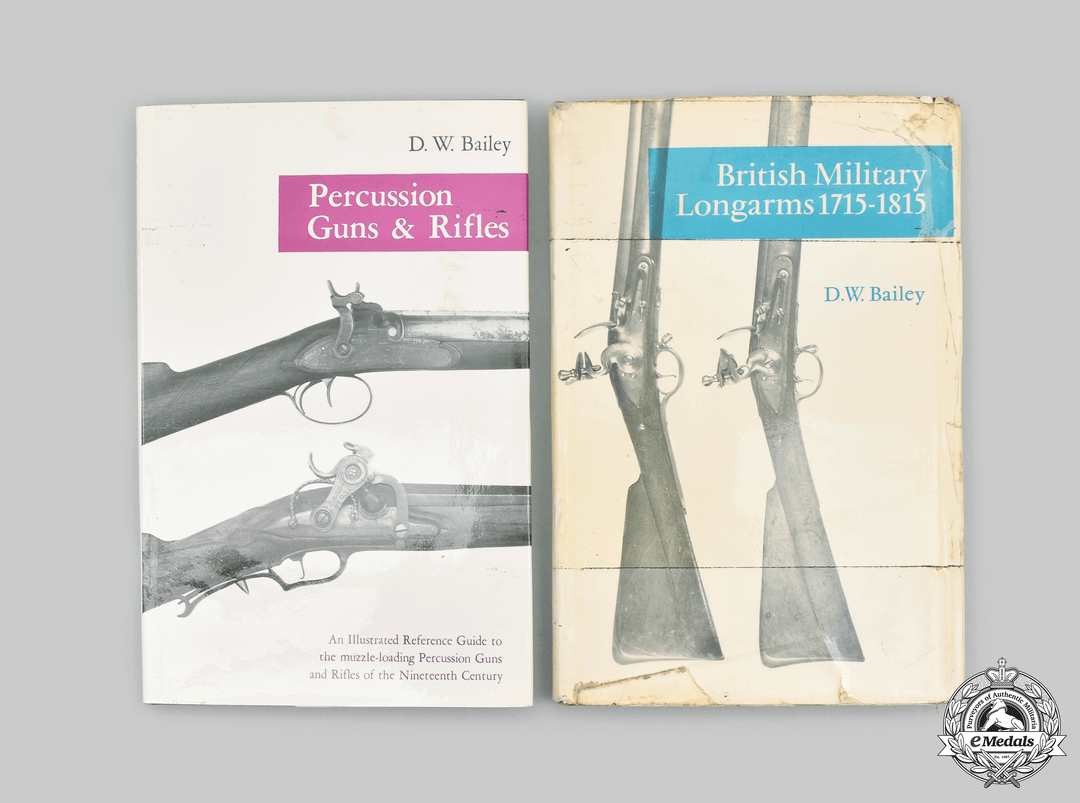1. British Military Longarms, 1715-1815: hardcover, maroon cloth cover, with dust jacket, entitled "British Military Longarms, 1715-1815", by D.W. Bailey, copyrighted by the author and Lionel Leventhal Limited in 1971, published by Stackpole Books of Harrisburg, Pennsylvania in 1971, printed in Great Britain, Library of Congress Catalog Card Number 76-162453, ISBN 0-8117-0301-0.