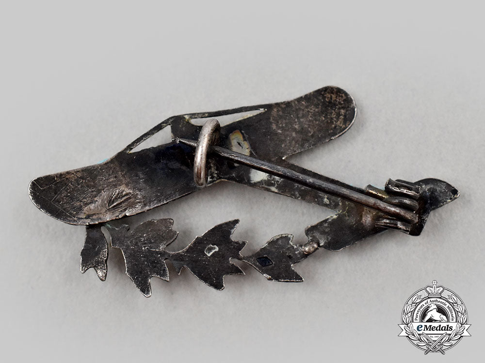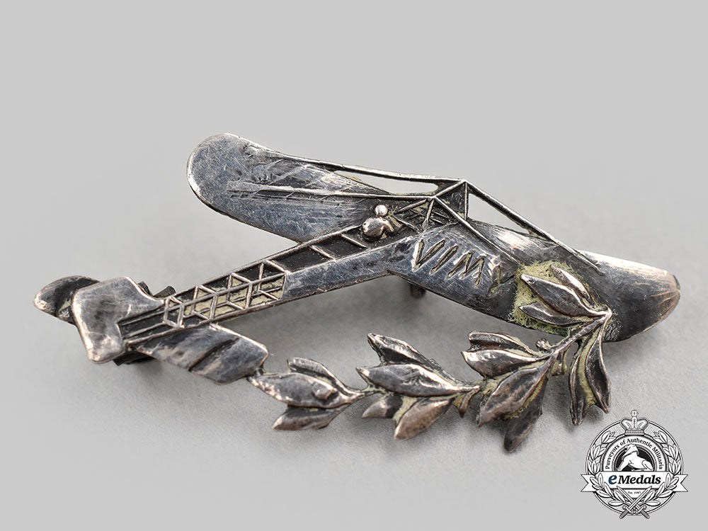 2. "Vimy" Airplane Lapel Badge: two-piece construction, in silver, unmarked, illustrating an airplane with pilot, with "VIMY" inscribed on the top of the right wing, framed by a branch of laurel leaves, measuring 35.5 mm (w) x 15.5 mm (h), with pinback. Very light contact, together, near extremely fine.