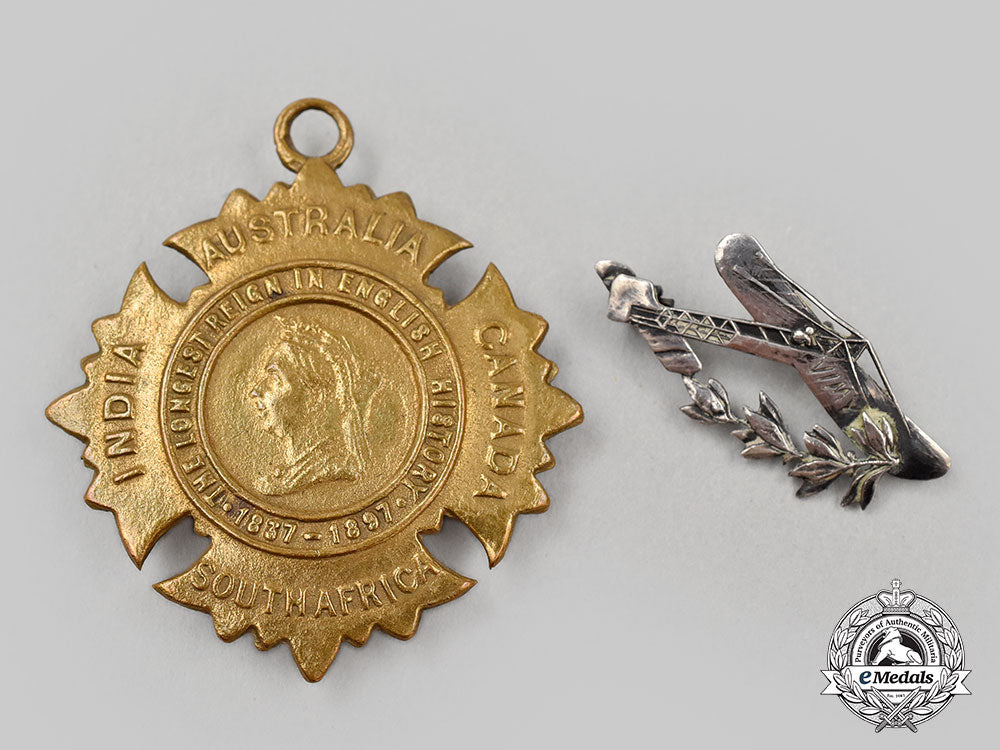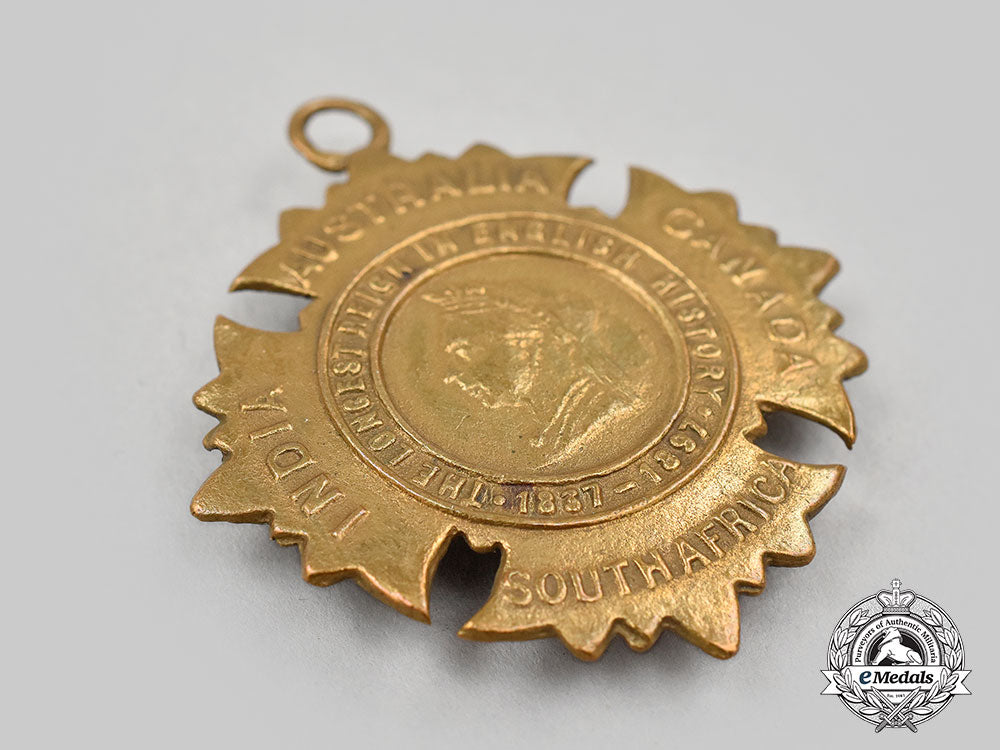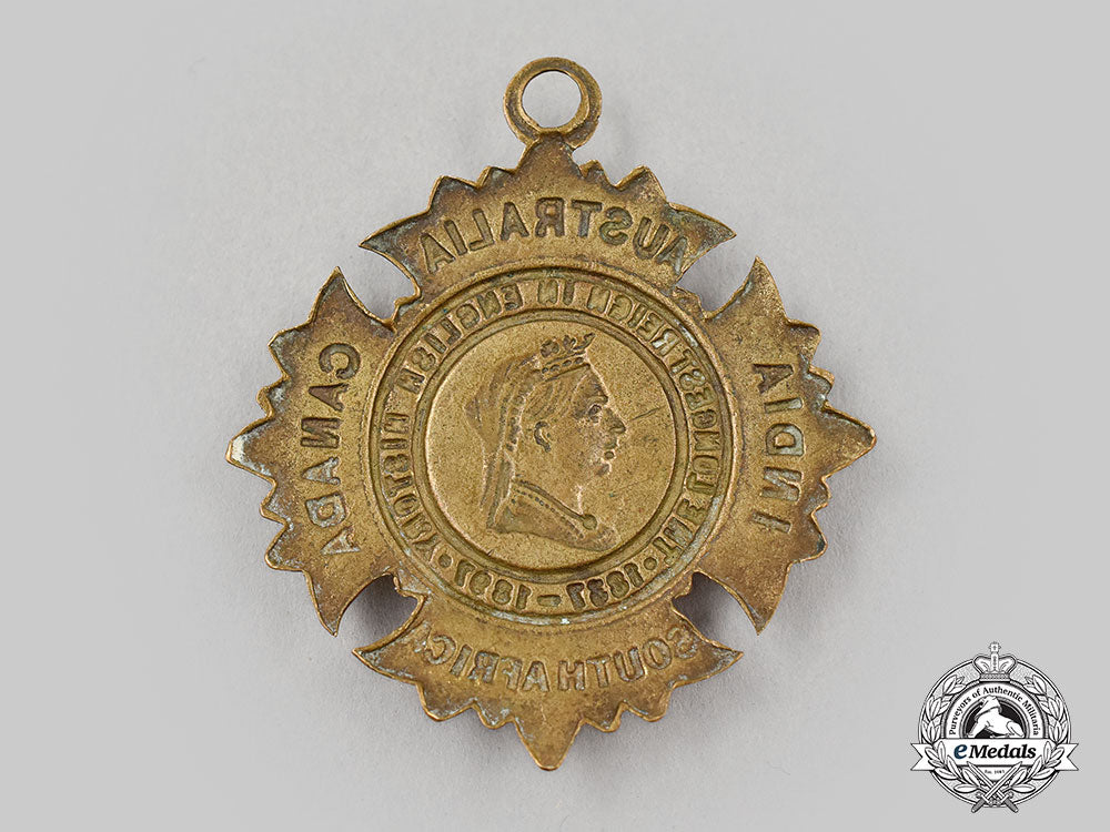 1. Sixtieth Anniversary of the Reign of Queen Victoria Medal 1837-1897: in die-stamped bronze gilt, illustrating the left-facing bust of Queen Victoria in the centre, surrounded by the inscription "THE LONGEST REIGN IN ENGLISH HISTORY / 1837-1897", inscribed with the countries of the Empire on the arms, clockwise from the arm at 12 o'clock: "AUSTRALIA, CANADA, SOUTH AFRICA, INDIA", measuring 46.7 mm (w) x 52.5 mm (h) inclusive of its integral ring.
