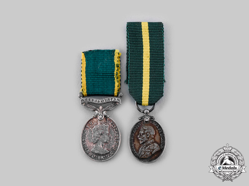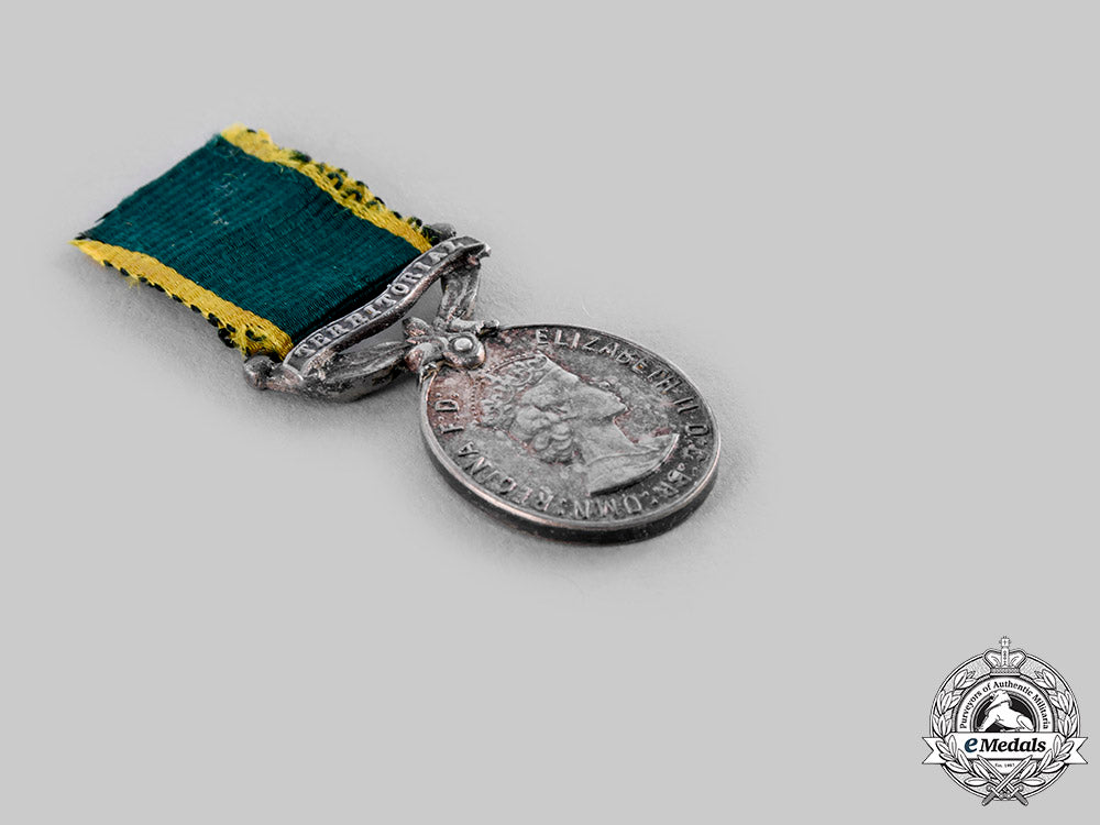 2. Efficiency Medal with Territorial Bar, ERII (in silver, measuring 17.3 mm (w) x 28 mm (h) inclusive of its bar, original ribbon). Un-mounted, dark patina on the TFEM, very light contact, original ribbons, near extremely fine.