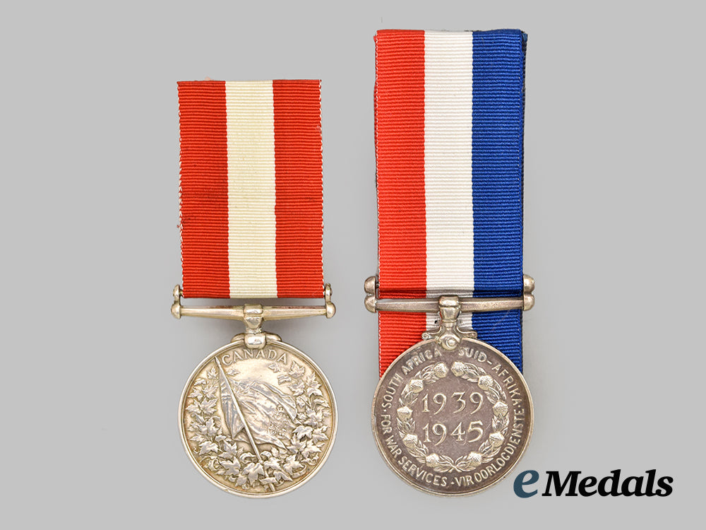 2. South African Medal for War Services 1939-1945. Un-named, original ribbon, court-mounted with dual push pins on the reverse. Light contact overall, edge nicks, very fine.