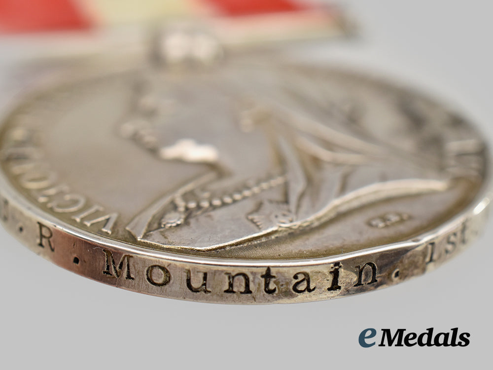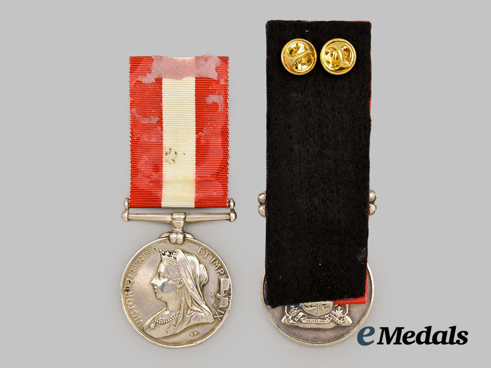 1. Canada General Service Medal 1866-1870, to Trooper John R. Mountain, 1st Quebec Cavalry (Tr. J.R. Mountain. 1st. Que. Cav.). Naming is officially impressed and partially shaved. Contact marks, edge nicks, bruised, exhibiting glue and paper residue on the replacement ribbon, was previously brooch mounted, poor condition.