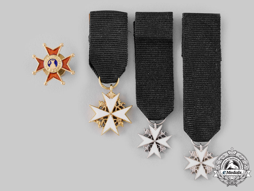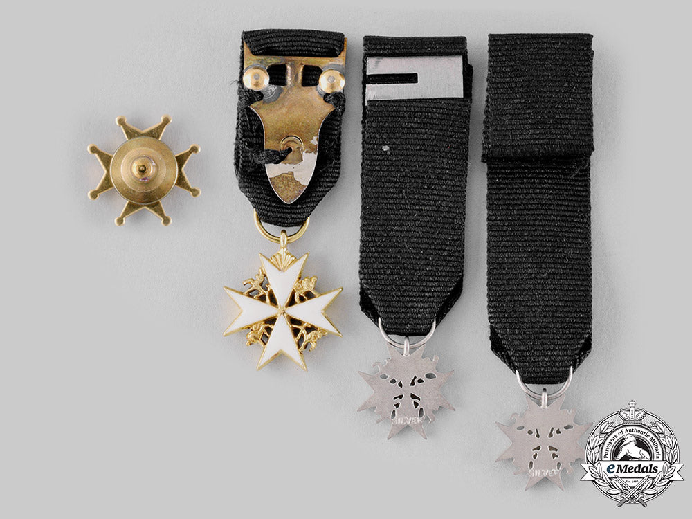 Vatican: Pontifical Equestrian Order of St. Gregory the Great (Ordine di San Gregorio Magno) (in silver gilt with red and blue enamels, measuring 17.7 mm (w) x 17.7 mm (h), push pin); and United Kingdom: three Orders of St. John (one in silver gilt with white enamels, measuring 18.5 mm (w) x 18.5 mm (h), original ribbon with silver prong attachment; two in silver with white enamels, marked "SILVER" on their reverses, measuring 15 mm (w) x 15 mm (h) each, both with their original ribbons). Intact enamels, extremely fine.