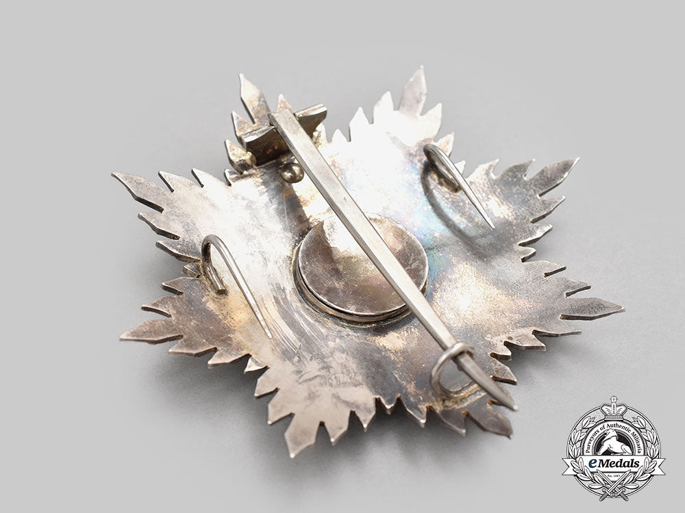 Instituted in 1925. A French made decoration, in silver, an eight-point star with clusters of five faceted rays, the obverse medallion features a Latin cross in Gold with a thin black enamel center, surmounted by a crown, the reverse offers a vertical pinback with dual stays, measures 85.4mm (w) x 84.3mm (h), weighs 61.7 grams, small slice to side of gold cross, otherwise in very fine condition.