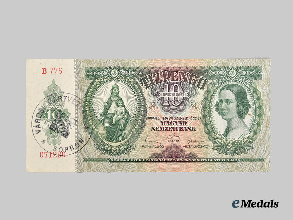 4. A 1936 10 pengő banknote, the obverse bearing a Sopron district Arrow Cross movement stamp, measuring 16 m (w) x 7 cm (h), in extremely fine condition.