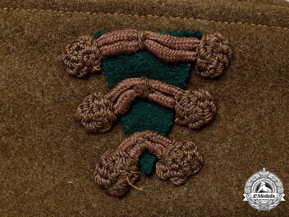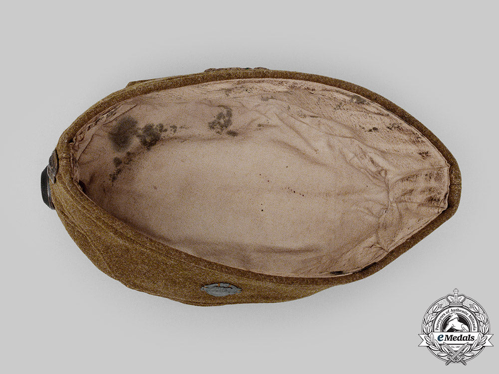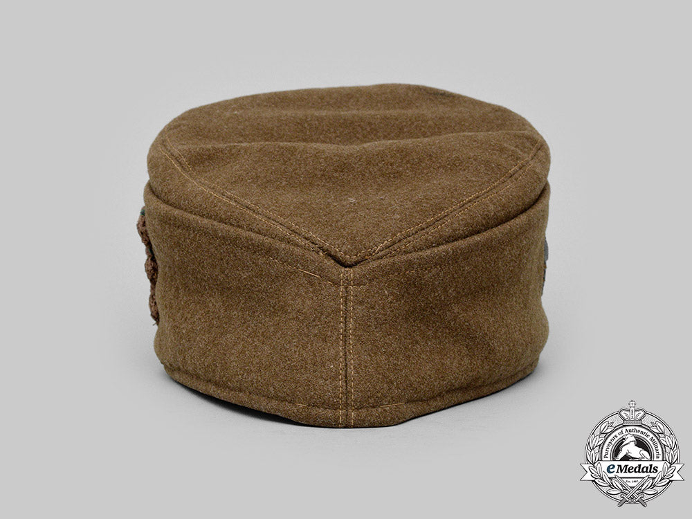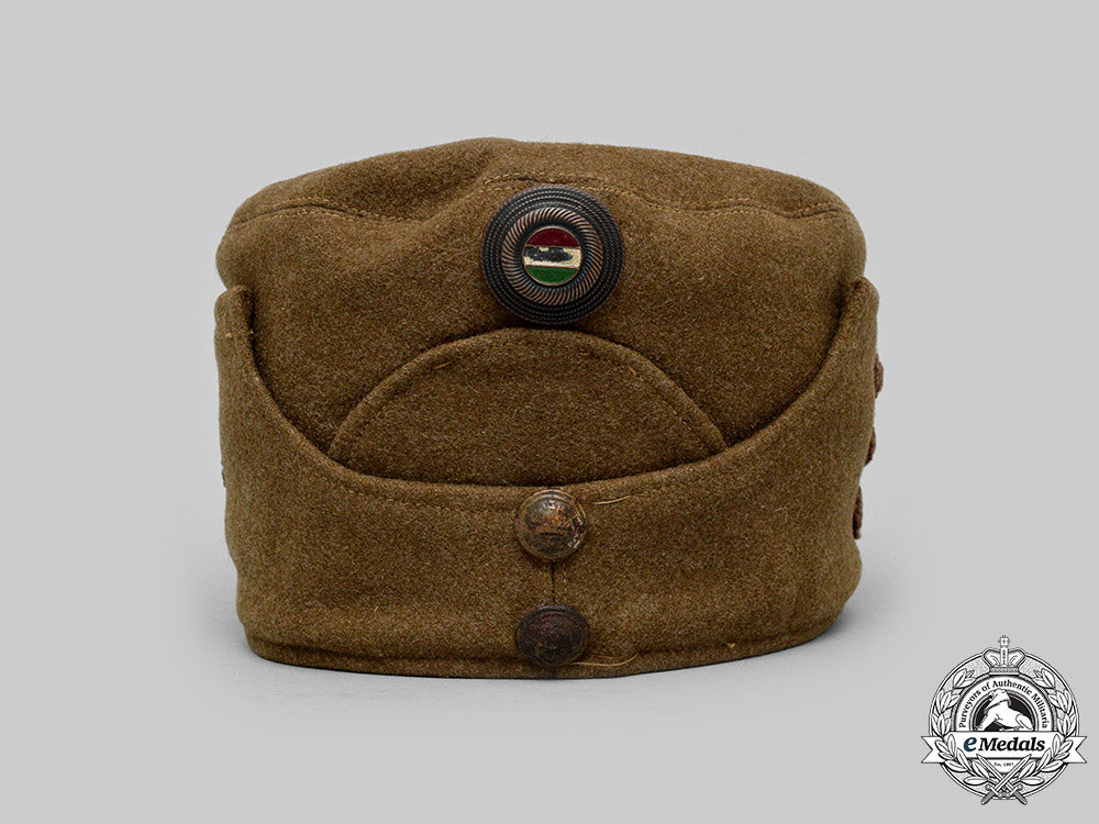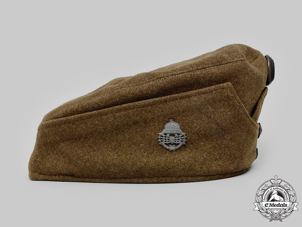A rare and extensive Second War Hungarian 1st Parachute Battalion group named to András Kiss, all coming from his family; including his side cap, constructed of olive-drab wool, fully surrounded by fold-down side panels held in place at the front by a row of machine stitching, the peak bearing an insignia constructed of bronze, consisting of multiple rows of raised pebbling with an enameled centerpiece in the form of a Hungarian tri-colour, measuring 30 mm in diameter, underneath the insignia are dual bronzed magnetic metal buttons bearing raised Crowns of St. Stephen, stitched onto the left flap is a forest green wool triangle held in place by three olive-drab threaded braids, the right flap bears a Communications Specialist insignia, constructed of feinzink and consisting of a laurel wreath joined together at the bottom by ribbon, overlaid by a bundle of four lightning bolts, and topped by a Crown of St. Stephen, measuring 25 mm (w) x 27 mm (h), the interior features a complete tan-coloured cotton liner, the cap is unmarked and measures 265 mm (w) x 130 mm (h) when folded, with some soiling of the interior liner evident, in overall near extremely fine condition.