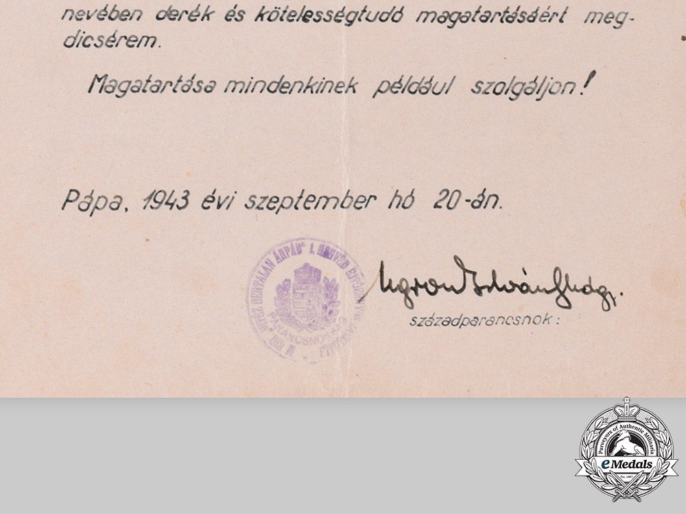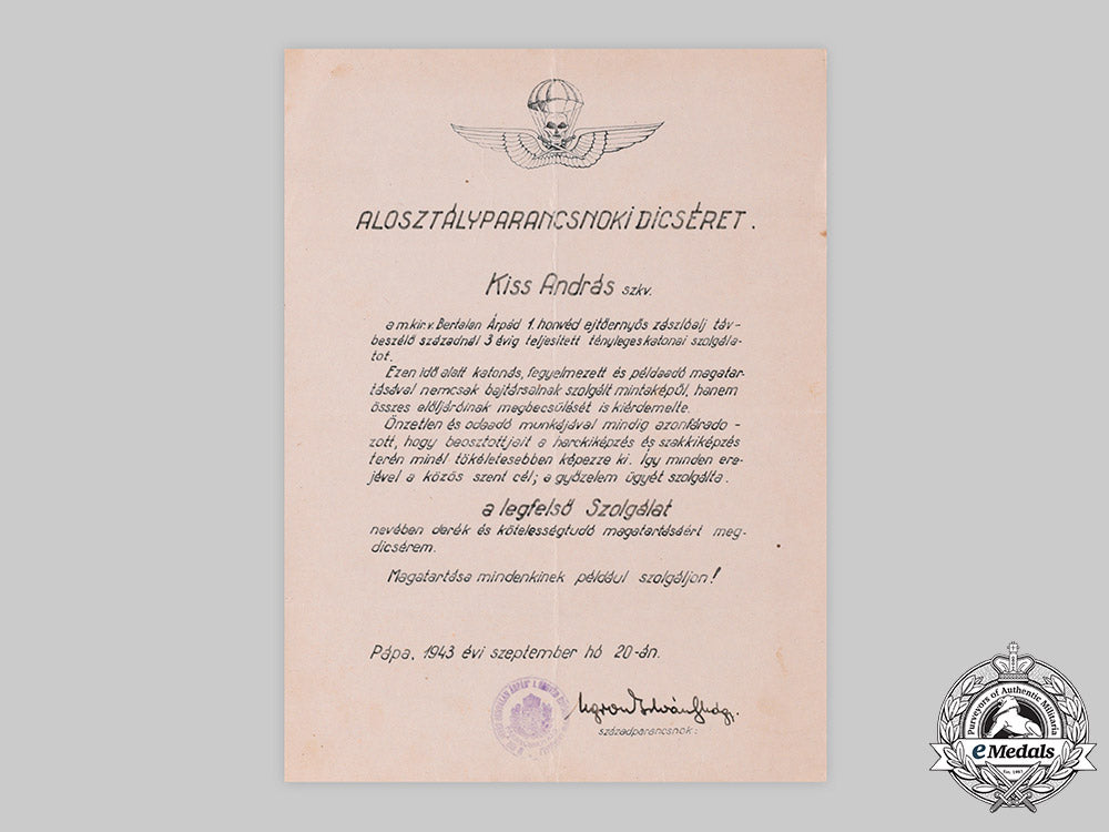 An award certificate for a Parachutist Badge, constructed of off-white paper stock with a handwritten black ink inscription, named to András Kiss, issued at Pápa on 20 September 1943, measuring 266 mm (w) x 362 mm (h), in near extremely fine condition and very rare.
