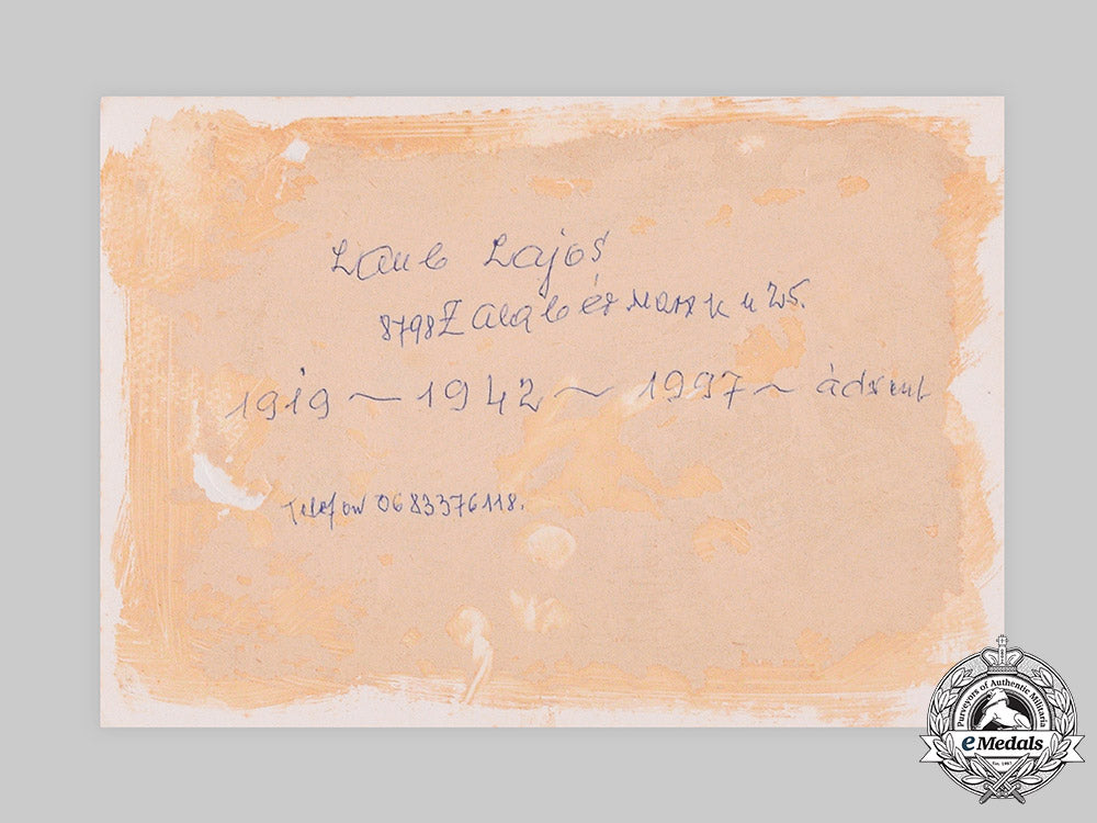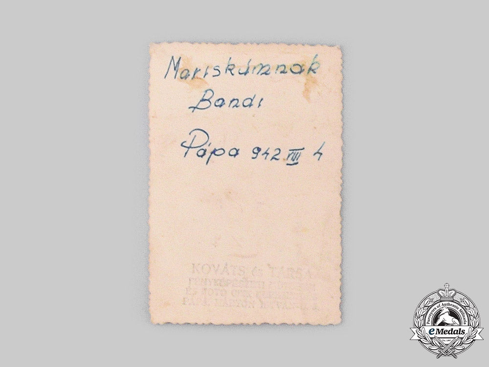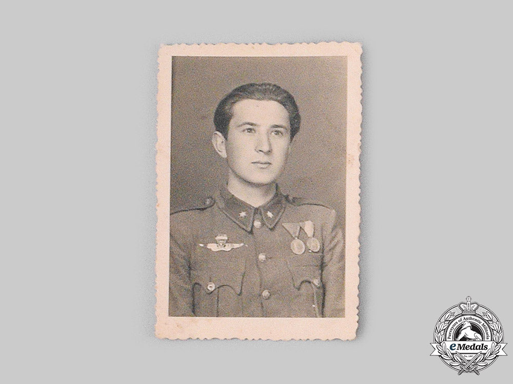 A lot of his personal photographs, including three depicting him as a parachutists landing during a training exercise, each affixed to a card stock backer, unmarked, measuring 125 mm (w) x 178 mm (h), with minor material fatigue evident, in overall better than very fine condition; two large photographs of András Kiss, one depicting the subject in a Hungarian Army uniform and the other in a parachutist uniform, both unmarked and measuring 128 mm (w) x 178 mm (h), in overall near extremely fine condition; a small photograph of András Kiss, depicted in uniform and wearing a Parachutist Badge, a Hungarian Bravery Medal, and a Medal for the Return of Southern Hungary, the reverse with a handwritten date of 8 April 1942 and a location of Pápa, measuring 58 mm (w) x 86 mm (h), in extremely fine condition, and; a photo collage of 1st Hungarian Parachute Battalion personnel, including a captioned photograph of András Kiss, dated 1942, with a handwritten inscription on the reverse, measuring 236 mm (w) x 168 mm (h), in extremely fine condition and very rare grouping.