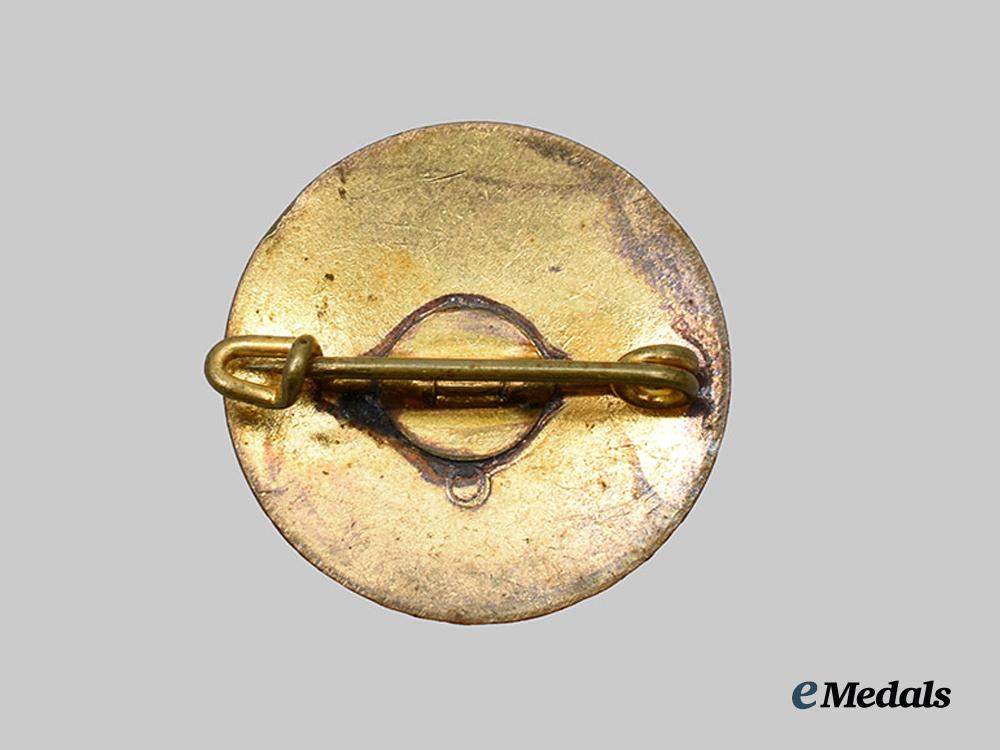 (Volksbund der Deutschen in Ungarn Mitgliedsabzeichen). Constructed of gilded bronze with multi-coloured enamels, the obverse bearing a white enameled disc overlaid by a gilded sunwheel-style gilt mobile swastika, set within a red enameled ring bearing a gilt inscription of “VOLKSBUND DER DEUTSCHEN IN UNGARN” (“PEOPLES’ FEDERATION OF GERMANS IN HUNGARY”), the reverse with horizontal pinback, measuring 23 mm in diameter, demonstrating minor flecking throughout the enamels with some loss of gilt to the centre of the swastika, in better than very fine condition.