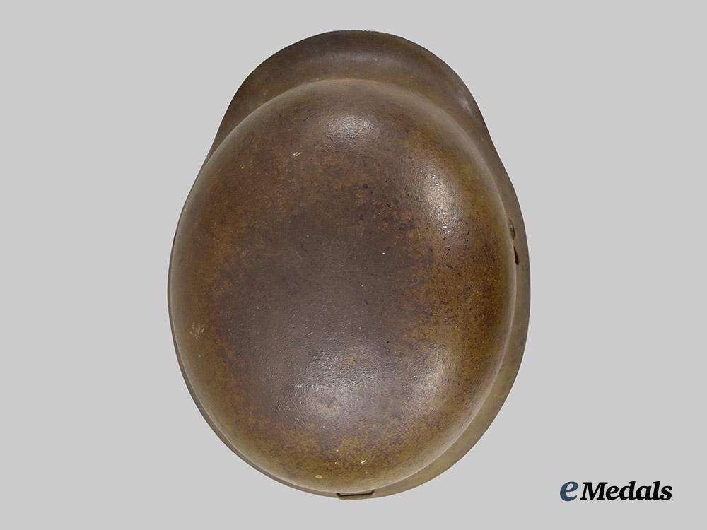 A battle-worn, Second World War period Hungarian M38 steel helmet, constructed of a single sheet of magnetic molybdenum steel which retains some of its original dark olive-drab paint. Three flattened rivets are distributed around the outer circumference for the accommodation of the interior fixtures, while a wide loop riveted to the back of the skirt allows for attachment to a backpack or other item of fieldgear when not in wear. The crown is also flanked by ventilation holes which are reinforced with magnetic metal loops crimped onto the shell. The rim is fully crimped, providing a smooth edge around the skirt. The interior features a partial blackened leather liner, transitioning into three sets of dual fingers, all perforated at the top with an eyelet for the accommodation of a drawstring which has been lost to time. Two magnetic metal D-rings descend from the sides of the liner and retain a partially-intact, two-piece, blackened leather chinstrap which fastens closed with a magnetic metal buckle. Illegible stamped marks remain visible on the back of the skirt. Measuring 23.5 cm (w) x 30 cm (l) x 15.5 cm (h), the helmet demonstrates issues consistent with both age and field use, including moderate loss of paint and surface oxidation throughout the interior and exterior of the shell, the loosening of the right side shell rivet, and material fatigue throughout the leather elements. Demonstrating the unmistakable signs of wear by Axis-affiliated Hungarian personnel during the Second World War, this storied example remains in a very fine condition.