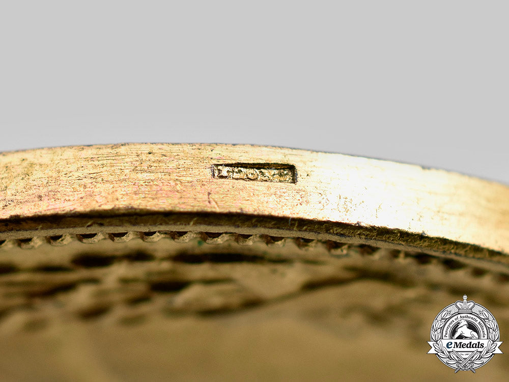 (Magyar Érdemrend). Instituted in 1922. In bronze gilt, marked "BRONZ" (bronze) on the edge, measuring 39.2 mm (w) x 44 mm (h) inclusive of its laterally-pierced ball suspension, original civil division triangular ribbon with hook and eye, light contact, near extremely fine.