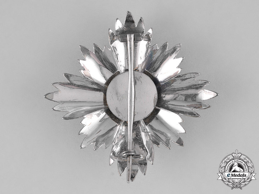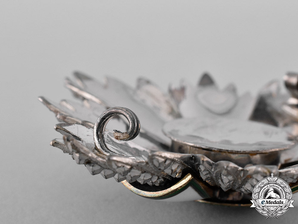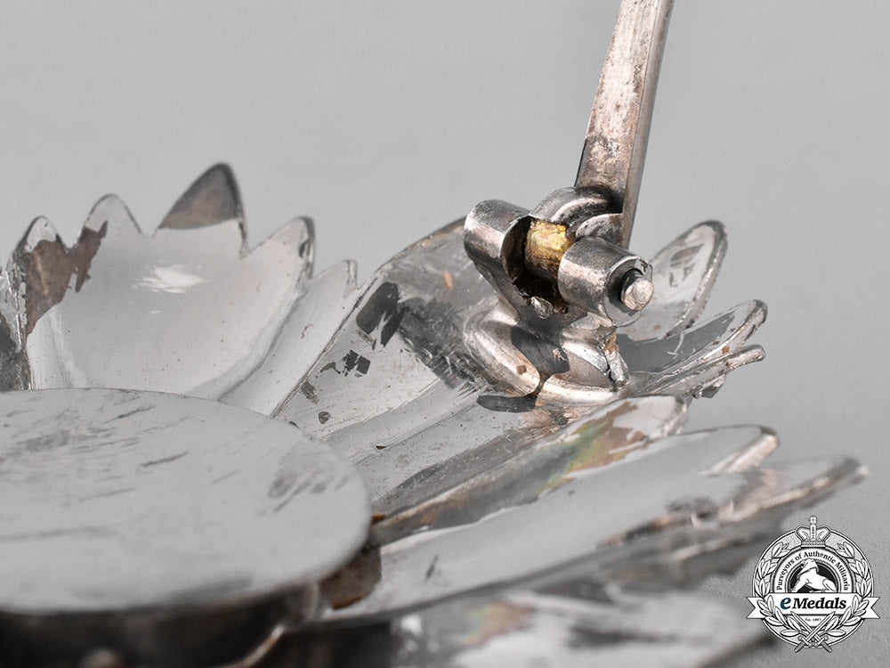 (Magyar Érdemrend). Instituted in 1922. (Post 1935 Issue). A multiple faceted ray silver star, obverse centre featuring a white enameled cross with green boarders, centre medallion presenting a silver gilt Patriarchal cross on a red enameled background with a surround of green laurels, reverse with principle pin assembly, measuring 78 mm (w) x 77 mm (h), near extremely fine.