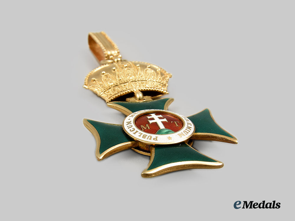 Institution Date: May 5, 1764. In silver gilt with green, white and red enamels, with a crown of St. Stephen suspension, measuring at approximately 42mm (w) x 75mm (h) and weighing 36.9 grams, with period ribbon, in presentation case, in extremely fine condition.