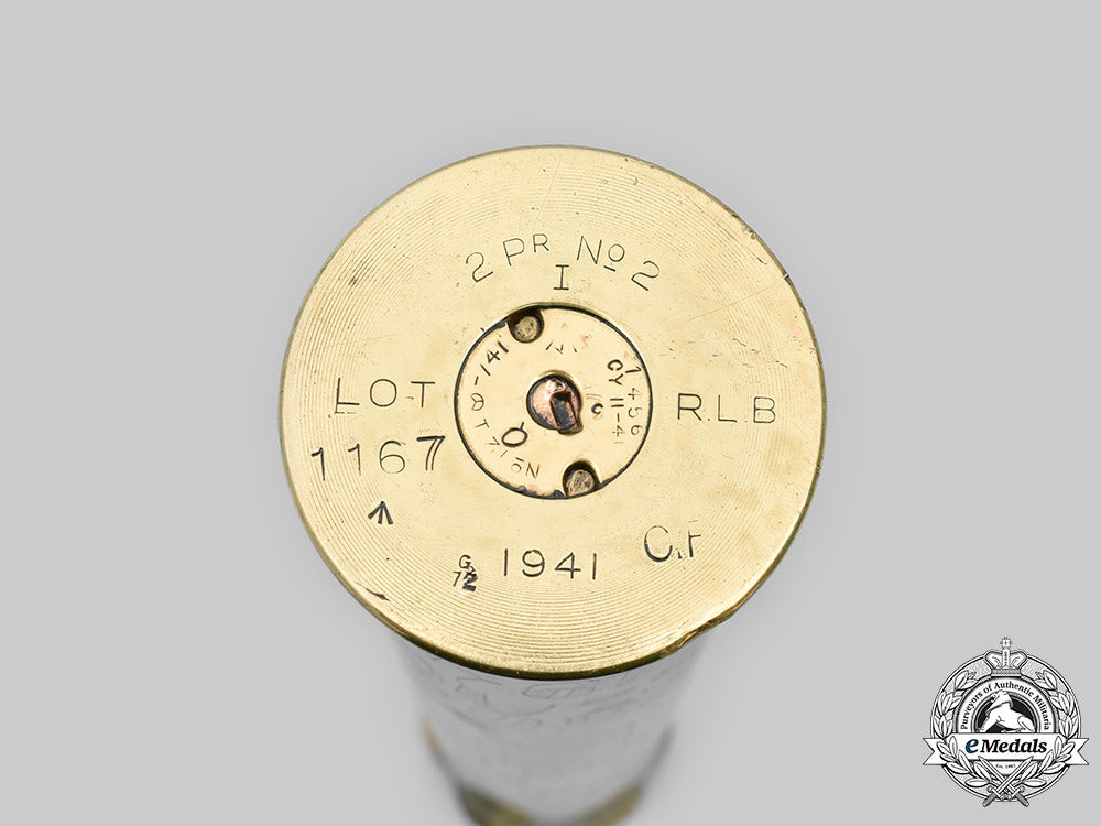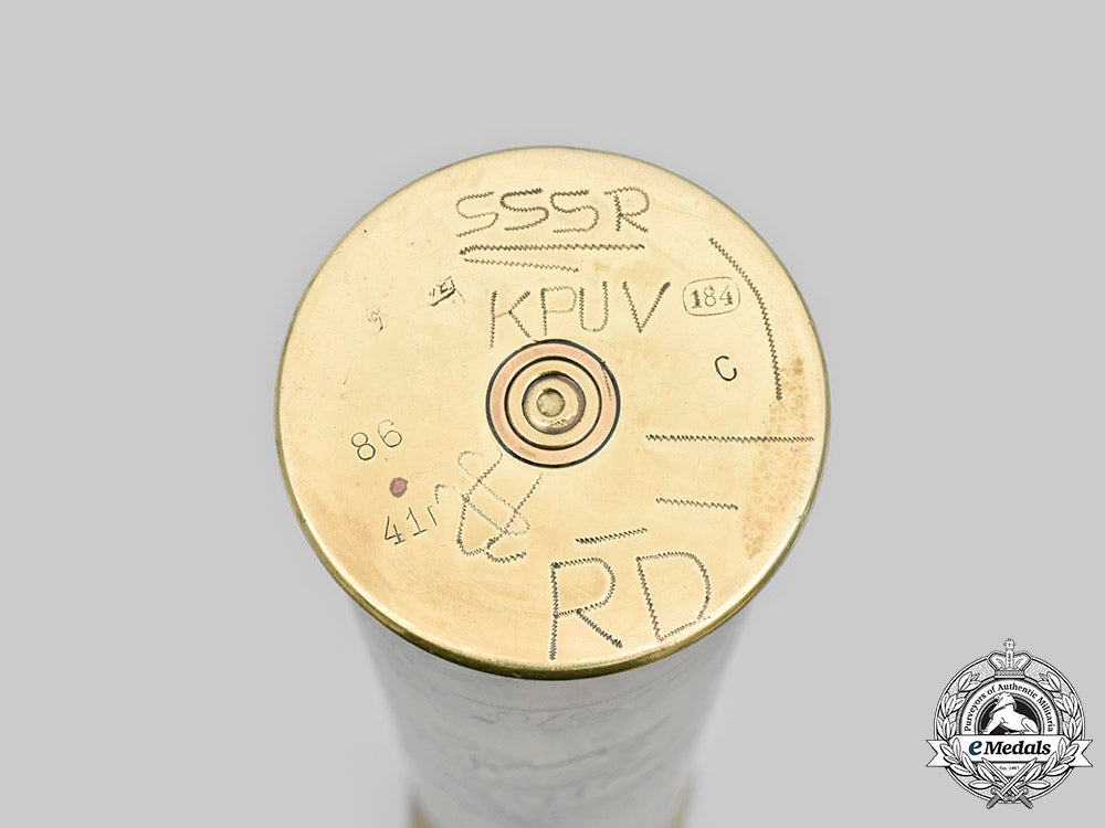 A pair of Eastern Front trench art brass shells, including a Hungarian-made case, the exterior bearing a central etched Hungarian coat of arms, above an inscription of “OROSZ ORSZAGBOL” (“FROM RUSSIA 1942”), below an inscription of “EMLÉKÜL MARISKÁMNAK” (“HE REMEMBERS”), flanked on each side by laurel branches, the base with calibre marks, measuring 45 mm (w) x 265 mm (h), in extremely fine condition, and; a Slovak-made shell, the exterior bearing a central floral design, topped by an etched inscription of “PAMIATKA Z RUSKA” (“MEMENTO FROM RUSSIA”), a Slovak Cross, and a date of “1943”, above a partially-legible inscription, the base bearing additional etched inscriptions and calibre marks, measuring 58 mm (w) x 268 mm (h), in extremely fine condition.