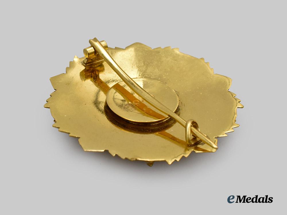 1. A breast star, constructed of a gilded alloy with multi-coloured enamels, the obverse consisting of a mult-pointed pebbled starburst, overlaid by a red enameled five-pointed star, in turn defaced by a gilded and enameled coat of arms of the Hungarian People’s Republic, the reverse bearing a central institution date of “1949”, with a raised barrel hinge and narrow vertical pinback meeting a round wire catch, unmarked, measuring 69.16 mm (w) x 69.92 mm (h), weighing 81.6 grams, demonstrating flecking surface chipping to the enamels (including a pronounced scratch visible to the three o’clock arm), in near extremely fine condition.