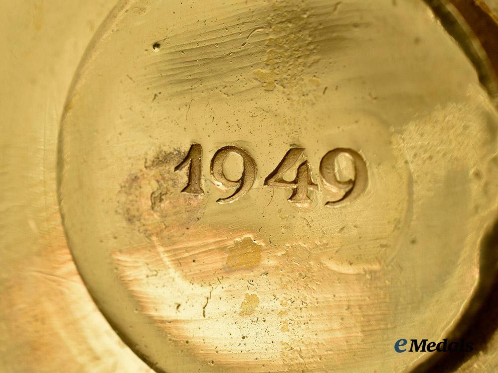 2. A matching small version, constructed of a gilded alloy with multi-coloured enamels, the obverse consisting of a red enameled five-pointed star with its arms joined through the voids by a radiant starburst, in turn defaced by a gilded and enameled coat of arms of the Hungarian People’s Republic, the reverse bearing a central institution date of “1949”, topped by an integral loop connecting to a period original tri-fold ribbon pinned with matching device, unmarked, measuring 41.98 mm (w) x 47.74 mm (h), weighing 23.8 grams (inclusive of ribbon), demonstrating minor flecking and scratching to the enamels with factory flaws also evident to the twelve o’clock arm, in near extremely fine condition.