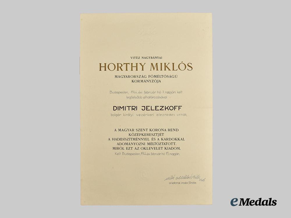 An Award Document for the Hungarian Order of the Holy Crown, Commander, with War Decoration and Swords, to Dimitri Jelezkoff, Lieutenant Colonel of the Bulgarian Royal Staff, awarded February 7, 1944, Budapest and confirmed February 15, 1944. The document is signed by the Chief of the Military Office. Embossed with the order symbol at the top of the page, measures 280 mm (w) x 410 mm (h), exhibiting creases and light wear, in extremely fine condition.