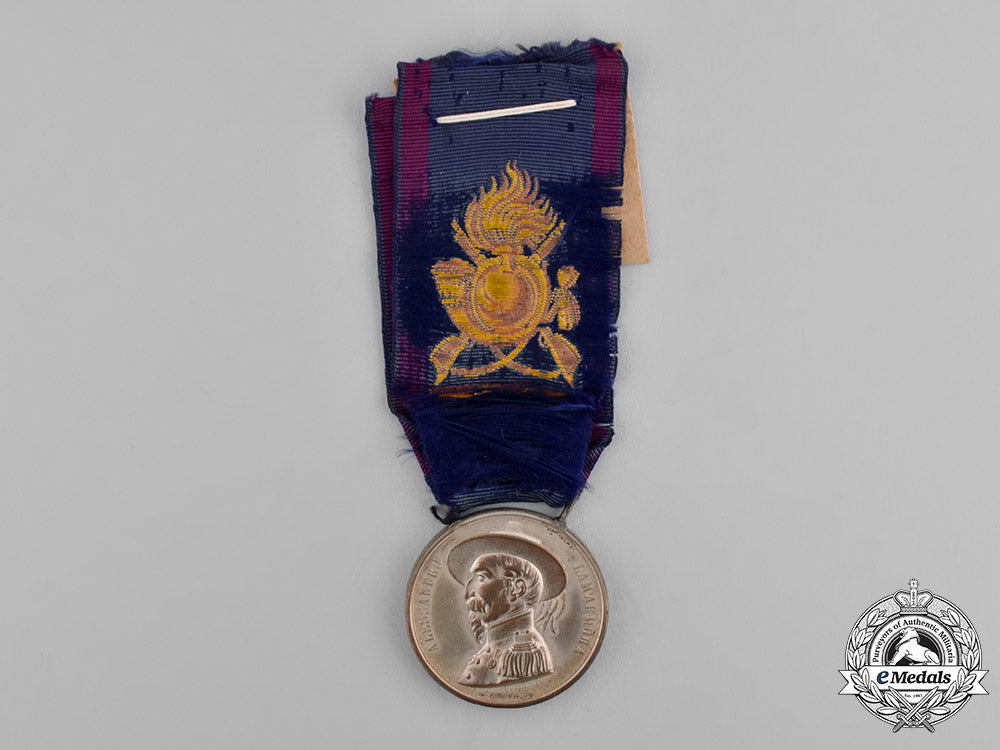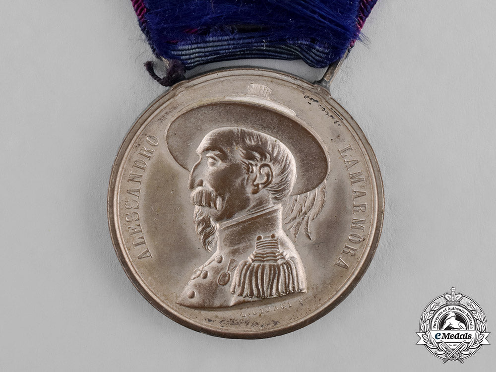 In silvered bronze, obverse illustrating the left-facing bust of General Alessandro La Marmora, the founder of the Bersaglieri, inscribed "ALESSANDRO" at the left and "LAMARMORA" at the right, engraver marked "L. GIORGI F" below the bust, reverse inscribed "50 ° ANNIVERSARIO DELLA FONDAZIONE DEI BERSAGLIERI 1886" and maker marked "SUDRIE Co ROMA", measuring 32 mm in diameter, scattered silvering wear, original ribbon with the embroidered Bersaglieri insignia on both sides, however the ribbon on the front side is frayed and experiencing separation, with both sides secured together via a string fed through a piece of cardboard at the top, near extremely fine.