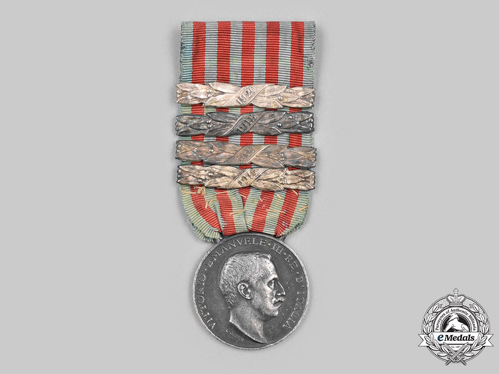 (Medaglia Commemorativi della campagne di Libia). Instituted in 1913. 4 Clasps - 1916, 1917, 1918, 1920. In silver, engraver marked "L. GIORGI" on the obverse, measuring 32 mm (w) x 36 mm (h) inclusive of its integral suspension, dark patina, bruised, edge nicks, pitting, original ribbon, fine.