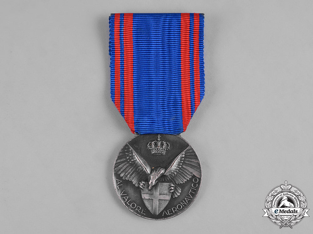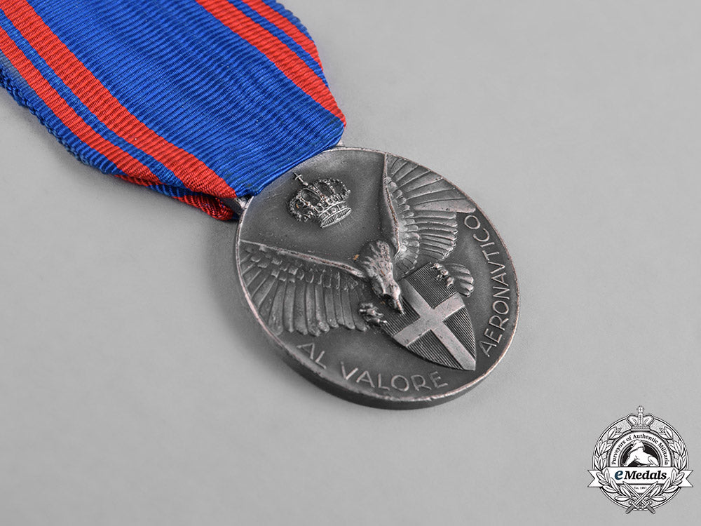 (Medaglia al valore Aeronautico). Instituted in 1929. In silver, measuring 35 mm (w) x 40 mm (h) inclusive of its integral suspension, contact marks and surface wear, original ribbon, very fine.