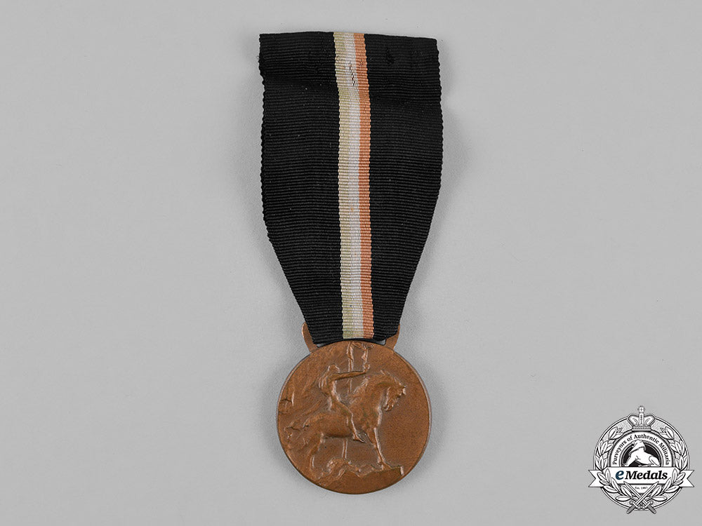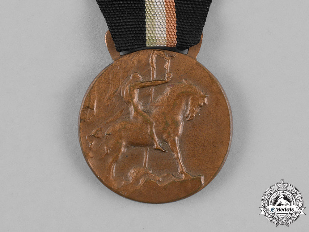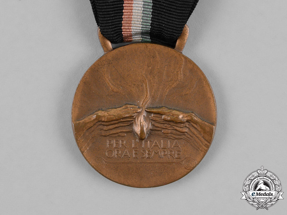 Medaglia commemorativa della campagna. Instituted in 1923. In bronze gilt, obverse illustrating a nude man on horseback, the two figures on a rocky outcrop, a spirit in the man's right hand summoning up a standard and fasces and engraver marked "SJ" (Stefano Johnson), reverse with rows of hands horizontally from the left and right either side of a flame, inscribed below "PER L’ITALIA ORA E SEMPRE" (For Italy Now and Always) above a line with a circular scroll at either end, measuring 32.2 mm in diameter, scattered gilt wear, original ribbon, near extremely fine.