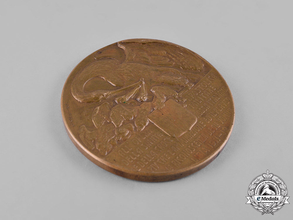 In bronze, obverse illustrating two nurses, one standing and one sitting, attending to a wounded soldier, with a large tent and a group of soldiers in the background, inscribed in Latin "INSIGNIS CHARITAS" (Capital Charity) below and marked with the engraver's interlocking initials "GO", reverse illustrating a pelican feeding two of its young above the Italian coat-of-arms, inscribed in Italian "ALL' OPERA APOSTOLICA DELLA SANITA MILITARE E DELLA CROCE ROSSA ITALIANA PIV CHE L'AMMIRAZIONE ED IL PLAVSO LA RICONOSCENZA DEGLI VOMINI LIBIA 1911-12" and engraver marked "M NELLI-INC.", measuring 60 mm in diameter, spotting and discolouration evident on the obverse, better than very fine.