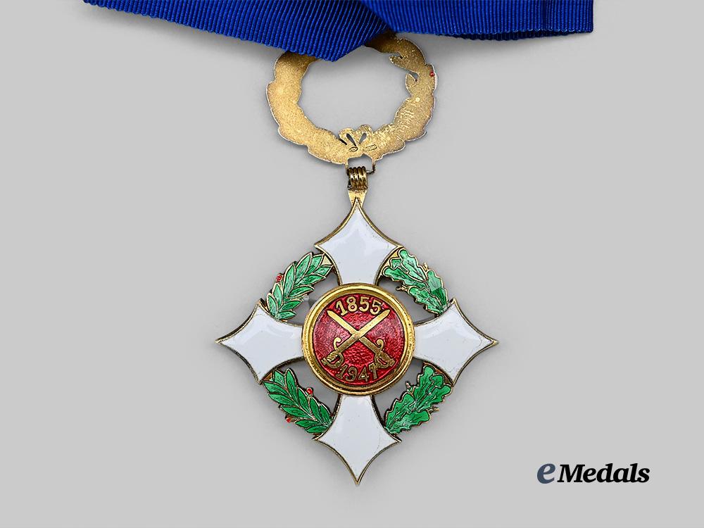 Instituted August 14, 1815. In silver gilt, a white enamel cross with green enamel segments in each quadrant, the obverse medallion featuring the initials RI, encircled by the inscription AL MERITO MILITARE, the reverse medallion features crossed swords with the dates 1855 1947 surmounted by a green enamelled wreath, measures 53 mm (w) x 85 mm (h - inclusive of wreath suspension), weighs 36.0 grams, marked 925 on the loop and the reverse of the wreath denoting silver fineness, and 858 MI mark denoting BOSI FRANCO manufacture in Milan, small enamel cracks in the green wreath, light gilt wear, a scarce decoration in extremely fine condition.