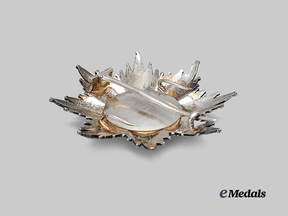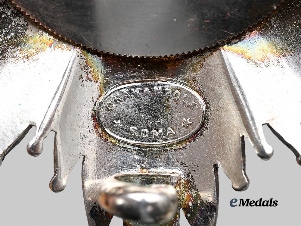 Accompanied by a Grand Cross Star, in silver, an eight point star featuring clusters of alternating smooth and faceted rays, the obverse medallion featuring a Lombardy crown on a blue enamelled field, surrounded by a Gold ring then a white ring inscribed VICT. EMMAN. II. REX. ITALIAE. MDCCCLXVI, encircled by a ring of gilt facets, surmounted by a black enamelled eagle on the 12 o’clock arm, reverse presenting a vertical pin suspension, the cartouche of CRAVANZOLA ROMA below the base, underside of pin is marked 900 with Italian silver marks, measures 87.0 mm (w) x 88.3 mm (h), weighs 72.12 grams, enamels intact, medallion and cartouche loose and will spin, hinge and clasp functional, in extremely fine condition.
