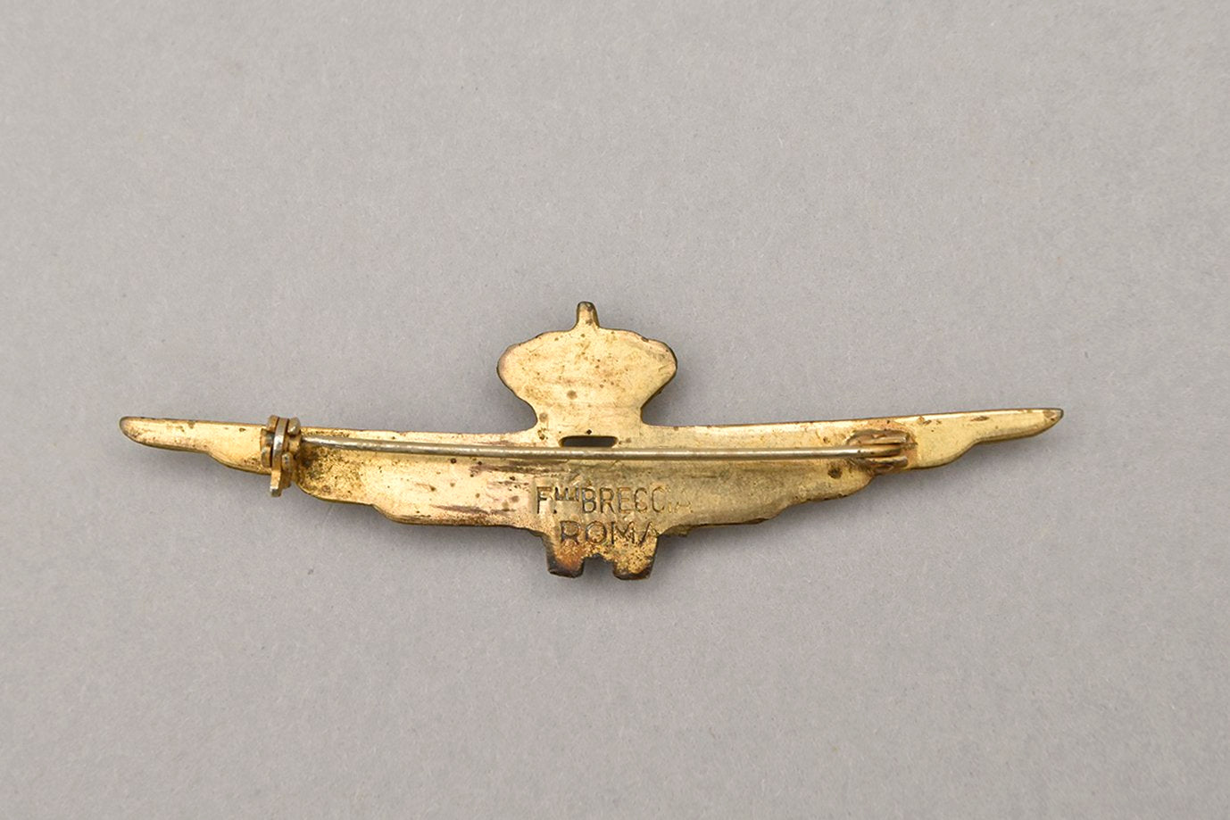 1. One set of Italian Pilots Wings,in bronze, maker marked on reverse “F. Breccia, Roma”, for the Fratelli Brothers, on a horizontal pinback, measuring at 75mm (l) x 22mm (w). This badge is from the pre-Armistice period but has had its axe blade severed from the fascio, likely done in the post-Armistice period.