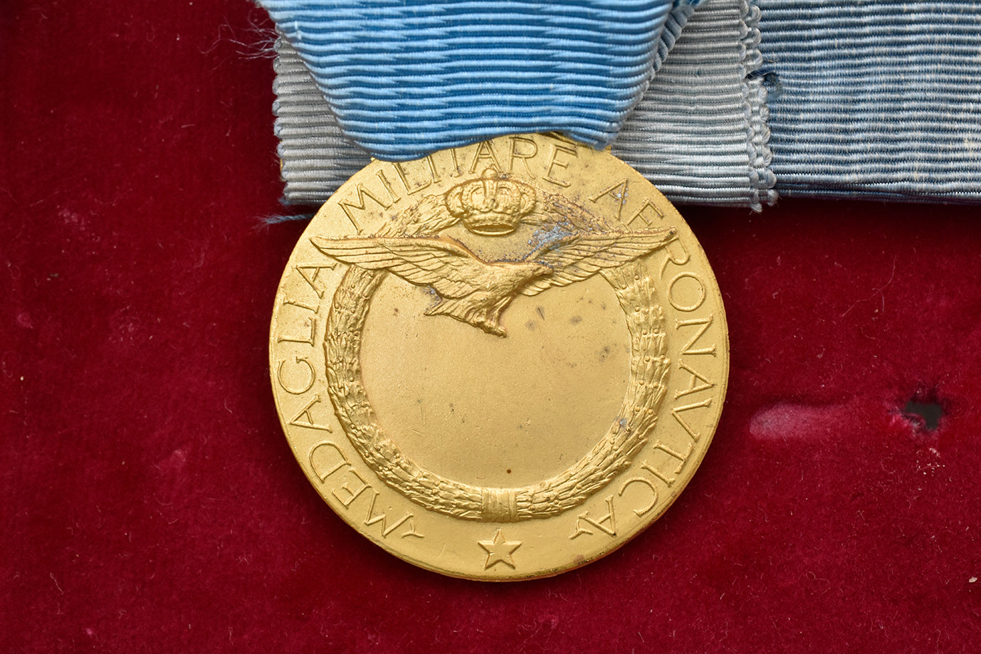 8. An Aeronautical Military Medal in gilded gold, bearing a profile of Vittorio Emanuele III, on period ribbon, measuring 35 mm in diameter.