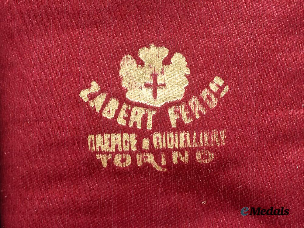 Instituted on November 8, 1900 by Royal Decree No. 358. In bronze gilt, unmarked, measuring 33.8 mm (w) x 36.3 mm (h-inclusive of ball suspension), original ribbon with two hook and eye attachments, near extremely fine. In fine original case of issue, green leather with gilt crowned VE (victor emmanuel), red interior with velvet medal bed, strong cach, very fine.