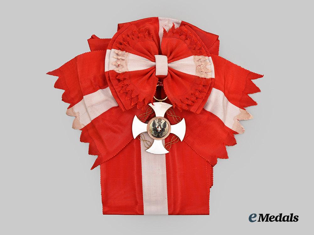 1. A sash badge, constructed of 18kt Gold, with blue, green, red, and white enamels, suspended from a fixed loop and swivel ring suspension from its period sash ribbon, consisting of a white-enameled hollow construction Gold cross with Gold knots in the quadrants between the arms of the cross, the obverse with a blue enameled centerpiece bearing a royal crown constructed of white, green, and red enamels, surrounded by a Gold ring, the reverse features a Gold central medallion bearing a black enameled eagle with a red and white enameled shield on its chest, surrounded by a matching Gold ring, unmarked, measuring 50.5 mm (w) x 52.7 mm (l), with reddish rub marks on the top arm of the cross from contact with its sash ribbon, in better than very fine condition.