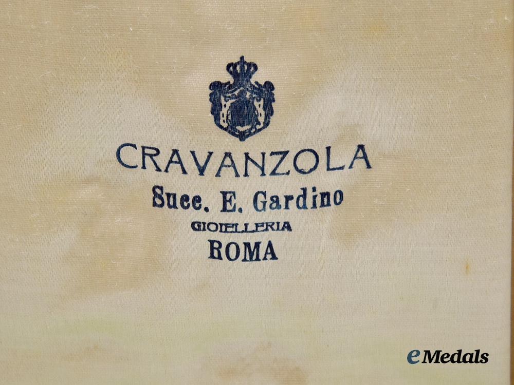 3. A Presentation Case, constructed of a lightweight wooden core, with a green lightly textured faux leather exterior, the exterior of the lid with the raised Royal Monogram of Victor Emanuel in gilt, the interior of the lid lined with an off-white cotton-silk material, embossed with the maker logo of “Cravanzola of Rome” in dark blue ink, with functional dual exterior metal hinges, intact interior fabric hinge cover, and functional exterior metal clasp closure, measuring 134 mm (w) x 307 mm (l).