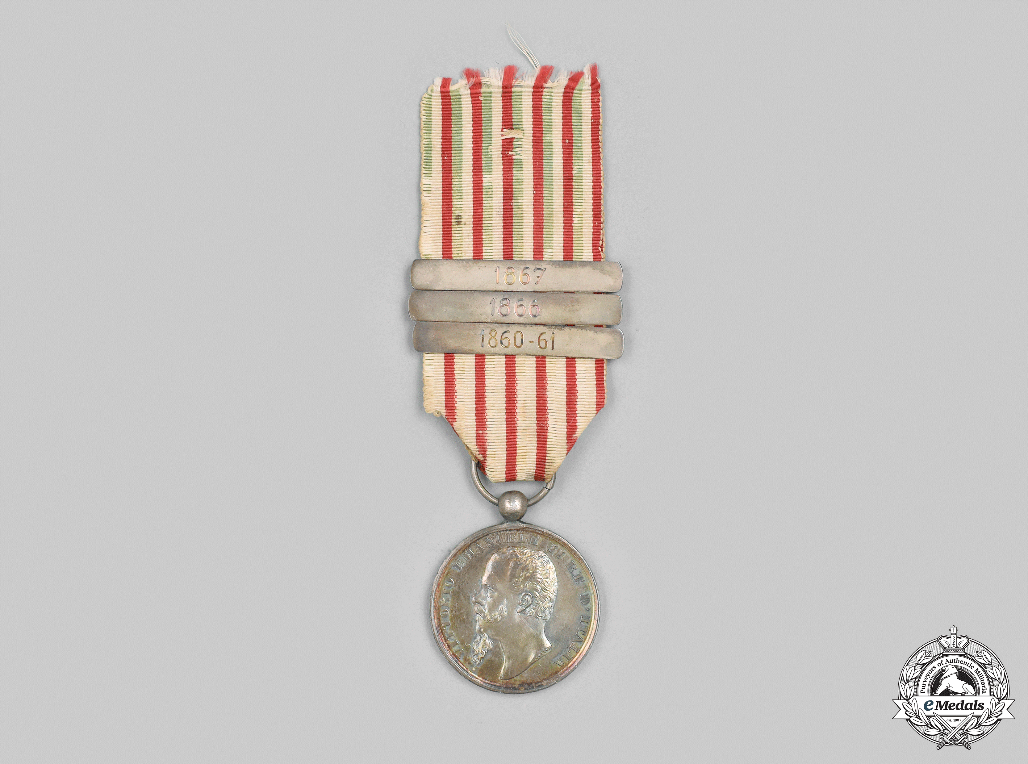 (Medaglia per le guerre d'Indipendenza e l'Unita d'italia). Instituted in 1865. 3 Clasps - 1860-61, 1866, 1867. In silver, engraver marked "CANZANI" (Demetrio Canzani) on the obverse, measuring 31.8 mm (w) x 37.7 mm (h) inclusive of its laterally-pierced ball suspension, edge nicks, contact marks, original ribbon, very fine.