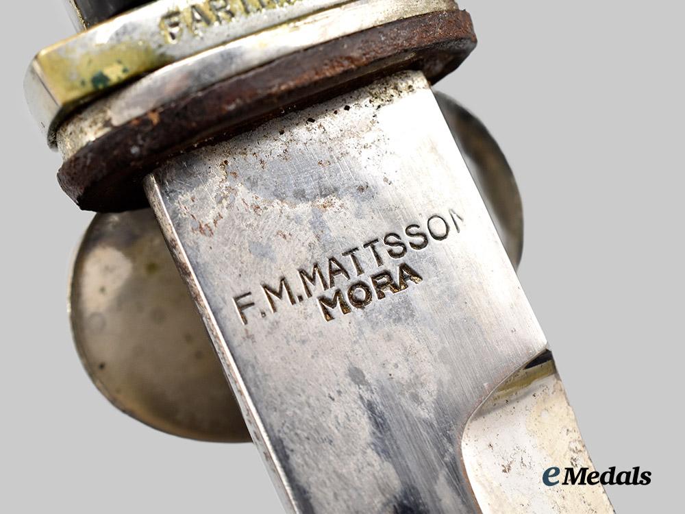 An interesting and well-preserved Italian National Fascist Party (PNF)/MVSN dress bayonet, measuring 34.5 cm in total length when inserted into the scabbard. It features a 20.5 cm-long, nickel-plated, magnetic steel blade which retains factory-original sharpening to both the tip and lower edge. A fuller runs the majority of the upper edge of each side of the blade. It sits securely within a nickel-plated alloy hilt with an intact leather buffer pad covering the seam. A maker’s mark of “F.M. MATTSSON, MORA” is visible on the ricasso, indicating production by the noted Swedish producer of edged weapons and metal goods. The hilt features a hooked quillon and pommel, the latter in the form of a double-sided lions’ head, with a pebbled clamshell emanating from the crossguard, in turn bearing a shield defaced by an engraved fasces. A stamped name of “FARINACCI” is visible on the reverse of the crossguard, and is either an owner attribution or reference to noted fascist-era politician Roberto Farinacci. Two pieces of black bakelite compose the handle grip, and are fastened in place with dual metal rivets which sit flush with the surface. Accompanying the bayonet is its original scabbard, constructed of an anodized magnetic metal shaft. A stud emanates from the side of the shaft just beneath the throat for the accommodation of a frog, which is constructed of multiple panels of brown leather and stitched into a loop for belt suspension. Minor issues consistent with age and wear are evident, and include some running marks and loss of nickel plating to the blade, minor loss of nickel plating to the hilt, and a small chip to the obverse handle grip. This unusual and privately-purchased bayonet remains in a better than very fine condition.