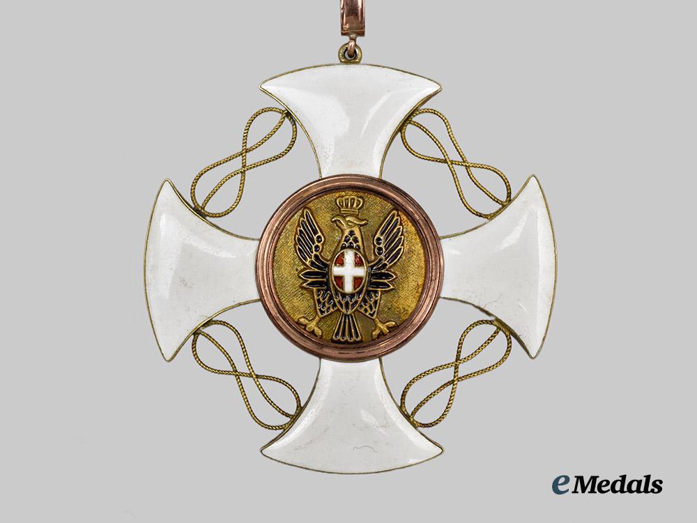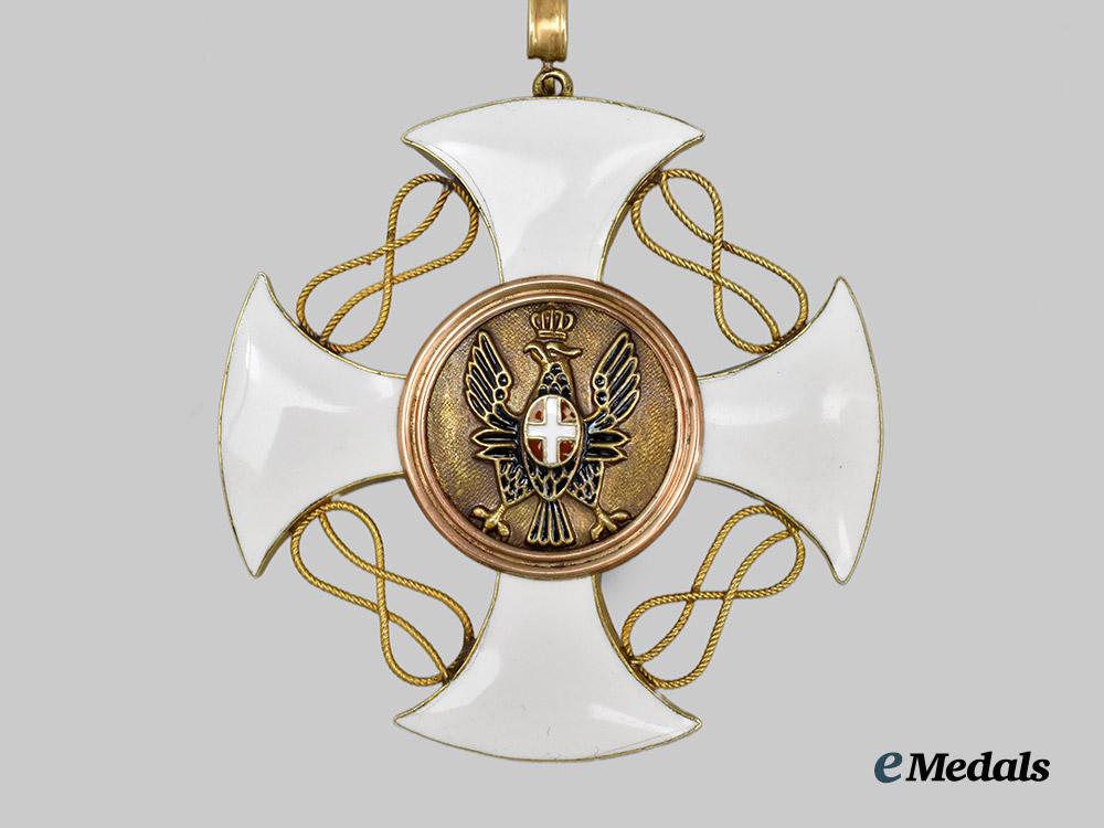 (Ordine della Corona d’Italia). Instituted February 20th, 1868. (c. 1900). Both constructed of 18kt Gold, with blue, green, red, and white enamels, suspended from a fixed loop and swivel ring suspension from its period original neck ribbon, consisting of a white-enameled hollow constructed 18kt Gold cross with matching Gold knots in the quadrants between the arms of the cross, the obverse with a blue enameled centerpiece bearing a royal crown constructed of white, green, and red enamels, surrounded by a Gold ring, the reverse features a Gold central medallion bearing a black enameled eagle with a red and white enameled shield on its chest, surrounded by a matching Gold ring, measuring 50 mm (w) x 52.6 mm (h-inclusive of integral ring), 17.09 grams as well as 50.02 mm (w) x 52.7 (h),16.63 grams, both on period ribbons, minor enamel crack to blue centre, otherwise better than very fine.