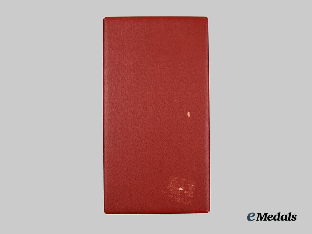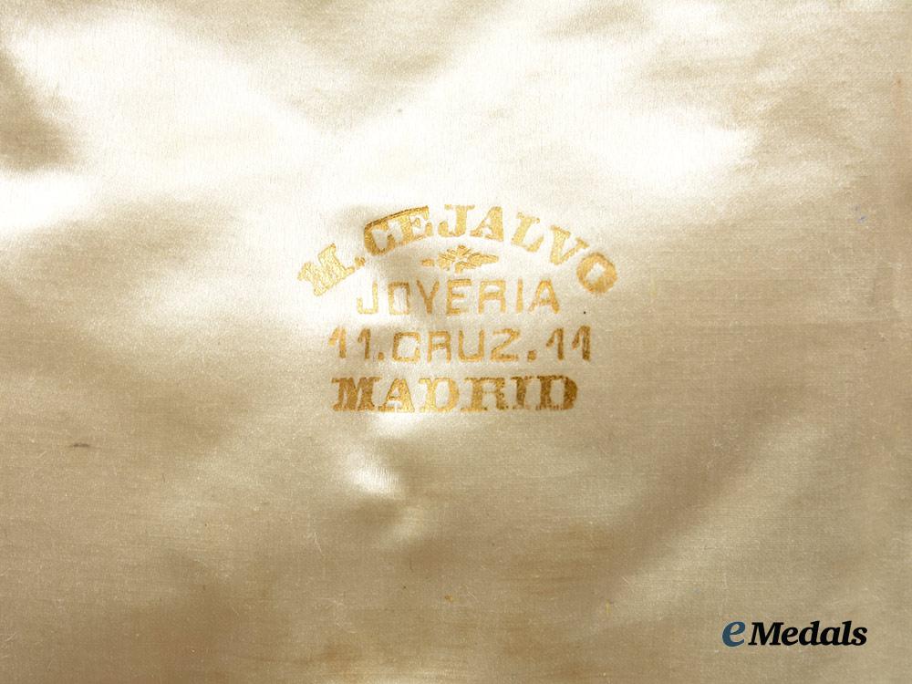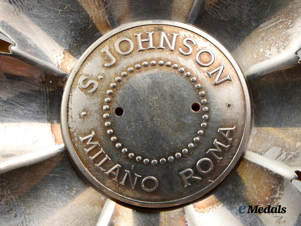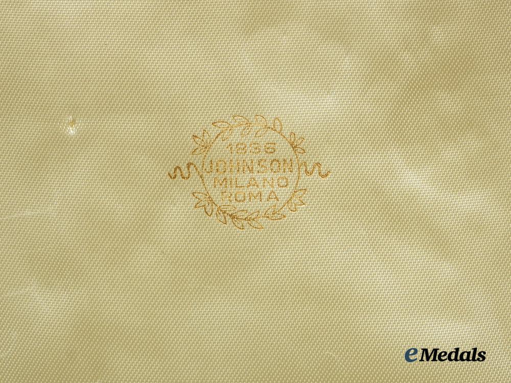 Accompanied by its presentation case, constructed of a lightweight wooden core with a lightly textured red faux leather exterior, the exterior of the case with functional dual metal hinges, with an intact interior fabric hinge cover, and functional exterior metal clasp, the interior of the lid is lined with padded satin and embossed “1936 Johnson, Milano, Roma” in gilt, the case with a recessed area at the top for placement of the sash ribbon with a molded insert to accommodate the breast star, sash badge, as well as the accompanying miniature and boutonniere bearing a beautiful rosette, measuring 170 mm (w) x 310 mm (l), in overall better than extremely fine condition.