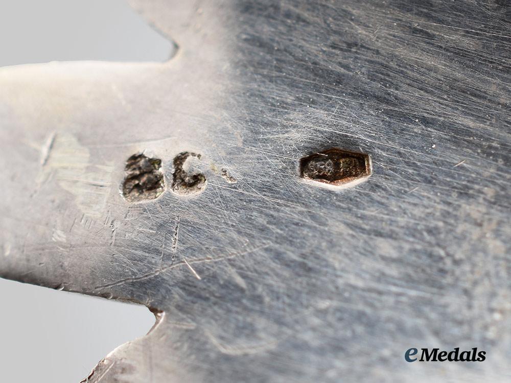 1. A Breast Star. Consisting of a silver eight-pointed star with multiple quillions per arm, the obverse with a Maltese Cross with dual ball finials superimposed on the award, with gilded fans between the arms of the cross, the cross itself is green and white enameled and bears a central gilded oval plaque bearing a rightward-facing depicting of Saint Lazarus, surrounded by a green ring of enamels inscribed “Atavis et Armis” in Latin, the reverse features a functional vertical pinback with a central silver maker’s medallion bearing the inscription of “S. Johnson, Milano, Roma”, otherwise unmarked, measuring 84.3 mm (w) x 83.5 mm (l).