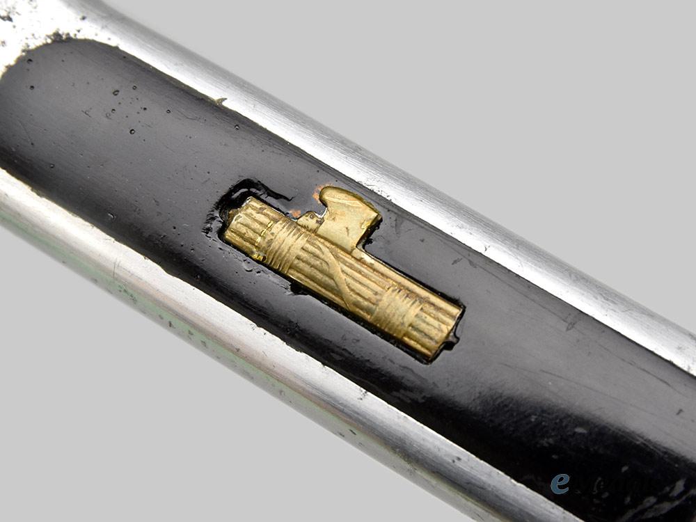 A well-preserved Militaria Volontaria per la Sicuerezza Nazionale (Voluntary Militia for National Security/MVSN) Officer’s dagger, measuring 35 cm in total length when inserted into the scabbard. It features a 20 cm-long, nickel-plated, magnetic steel blade which retains factory-original sharpening to both the tip and lower edge. Unmarked, the blade sits securely within a one-piece aluminum hilt. A hooked quillon and eagle’s head pommel facilitate a firm grip. The handle is inset with black bakelite inserts on both sides, the obverse featuring a central gilded fasces. Accompanying the dagger is its original scabbard, constructed of a black painted magnetic metal shaft featuring a bronze tip. Dual bronze integral rings set into the upper third of the shaft retain loops for the accommodation of a hanger. Issues consistent with age and wear are evident throughout, and include some running marks to the blade, loss of finish to the hilt, scratching of the scabbard paint, and the loss of the scabbard’s throat catch, the latter rendering the dagger loose during storage. An untouched example, this dagger remains in a very fine condition.