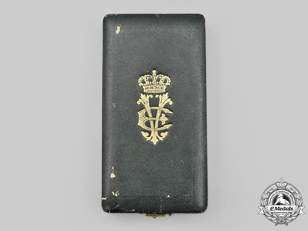 (Ordine dei Santi Maurizio e Lazzaro). Instituted in 1434. In 18K Gold with green and white enamels, weighing 21.8 grams, measuring 53.7 mm (w) x 84.8 mm (h) inclusive of its crown suspension, intact enamels, on its original full-length neck ribbon, extremely fine. In its hardshelled case of issue, forest green dimpled exterior, monogram of King Vittorio Emanuelle III in gold-coloured ink on the lid, inside lid in white cloth, padded and maker marked "L RAVIOLO E. GARDINO / Successori / Dco CRAVANZOLA / Prov. Della R. CASA / E R.R. MINISTERI / CORSO UMBERTO I / 338 - 339 - 340 / ROMA", base with a raised platform and incorporating a recessed medal bed in black felt, measuring 78.5 mm (w) x 151.7 mm (h) x 25.3 mm (d), scuffing and wear evident on the exterior, case very fine.