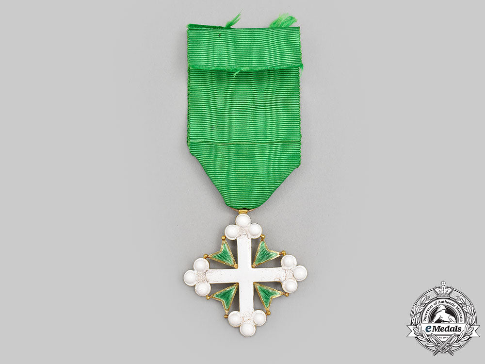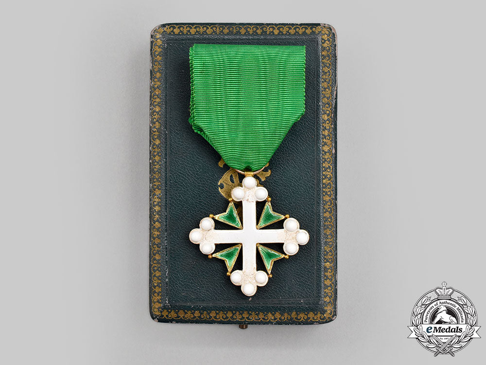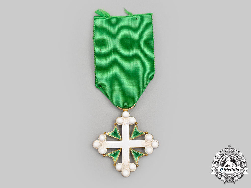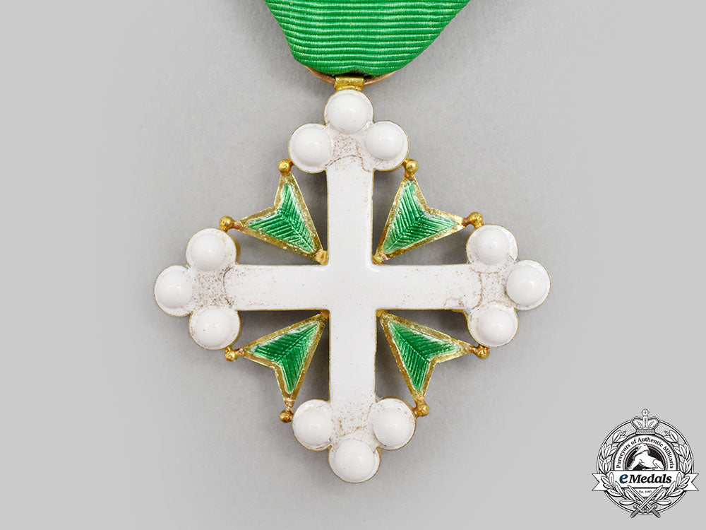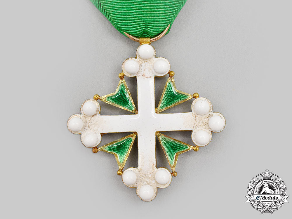(Ordine dei Santi Maurizio e Lazzaro). Instituted in 1434. In 18K Gold with green and white enamels, weighing 9.2 grams, unmarked, measuring 42.3 mm (w) x 41.8 mm (h), residue evident around the three ball cluster on the ends of all four arms on both sides, otherwise the enamels are intact, original ribbon, near extremely fine. In its hardshelled case of issue, forest green dimpled exterior, crowned monogram of King Vittorio Emanuelle III in gold-coloured ink on the lid, inside lid in ivory satin and padded, base incorporating a raised platform in cream felt with a recessed medal bed, measuring 67.5 mm (w) x 108 mm (h) x 22 mm (d), very light wear evident on the exterior, case also extremely fine.