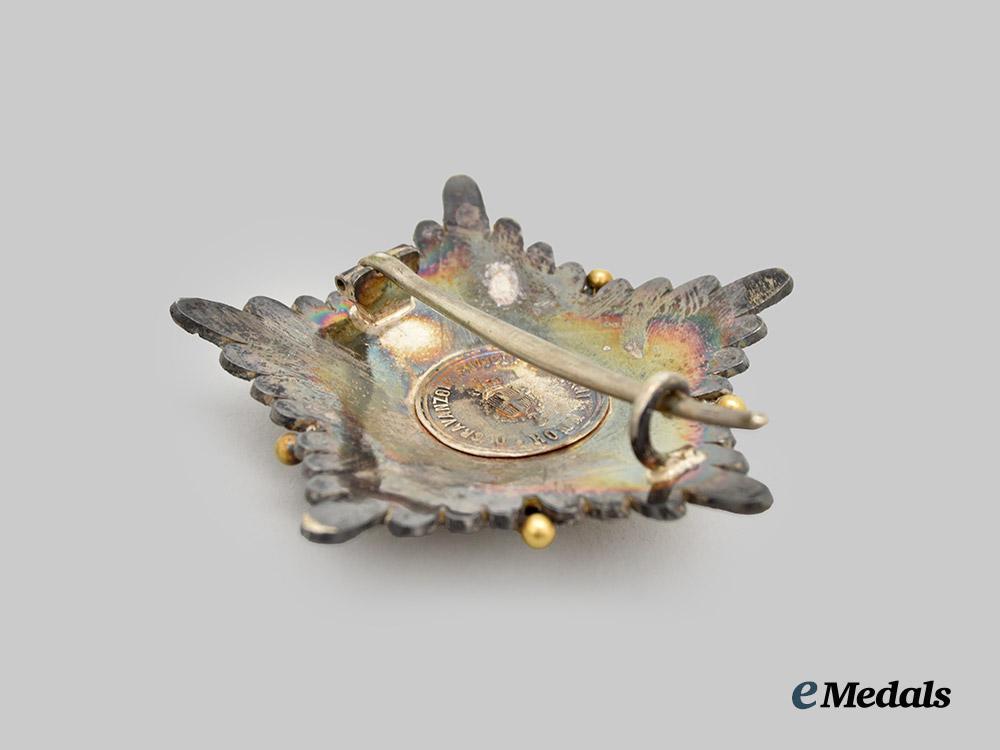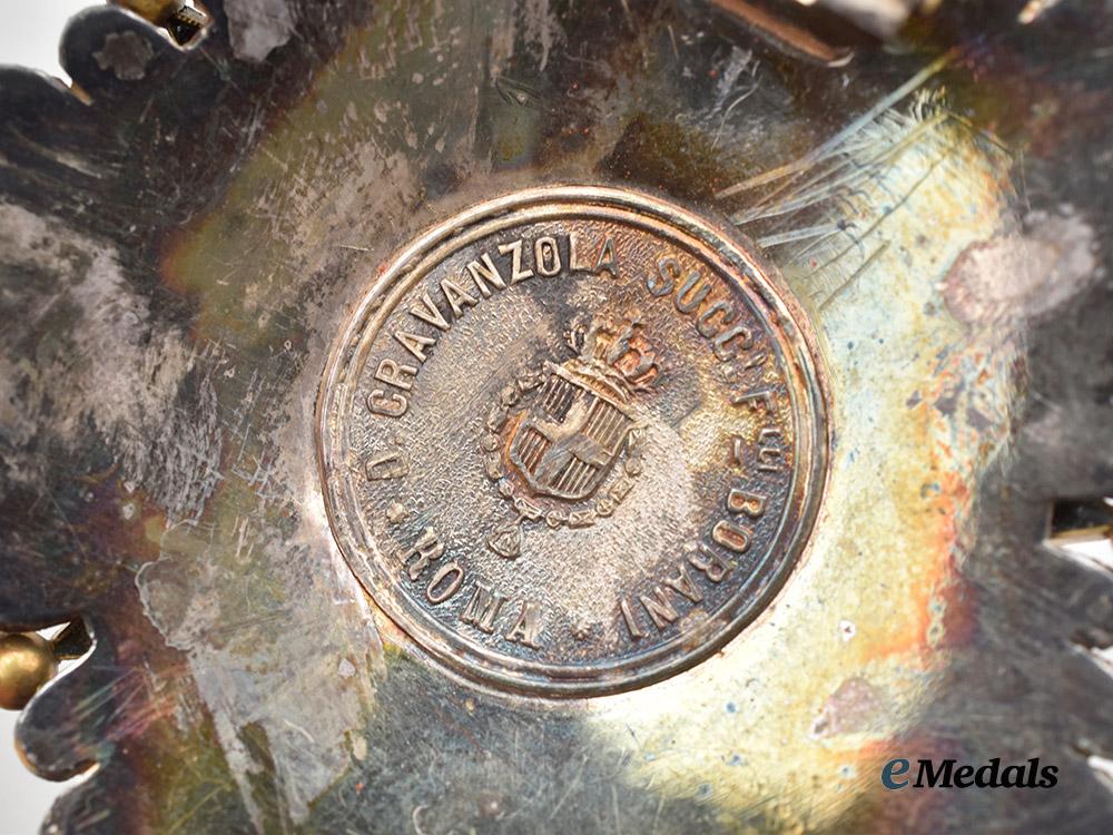 (Ordine coloniale della Stella d'Italia). Instituted in 1914, discontinued in 1943. In silver, featuring a five point silver star with clusters of faceted rays, the order’s insignia superimposed on the obverse in Gold featuring a white enamelled star with ball finials, the obverse medallion presenting the crowned cypher of Victor Emmanuel on a red enamelled disc encircled by a green enamelled ring dated 1911, the reverse features a single vertical pin with central cartouche of E. GARDINO SUCC. CRAVANZOLA ROMA, the star measures 70 mm (w) x 67 mm (h), weighs 45.03 grams, reverse marked with ZII Dutch .835 silver fineness stamp, dark patina at the edge of the silver rays, enamels intact, functional pin, in extremely fine condition.