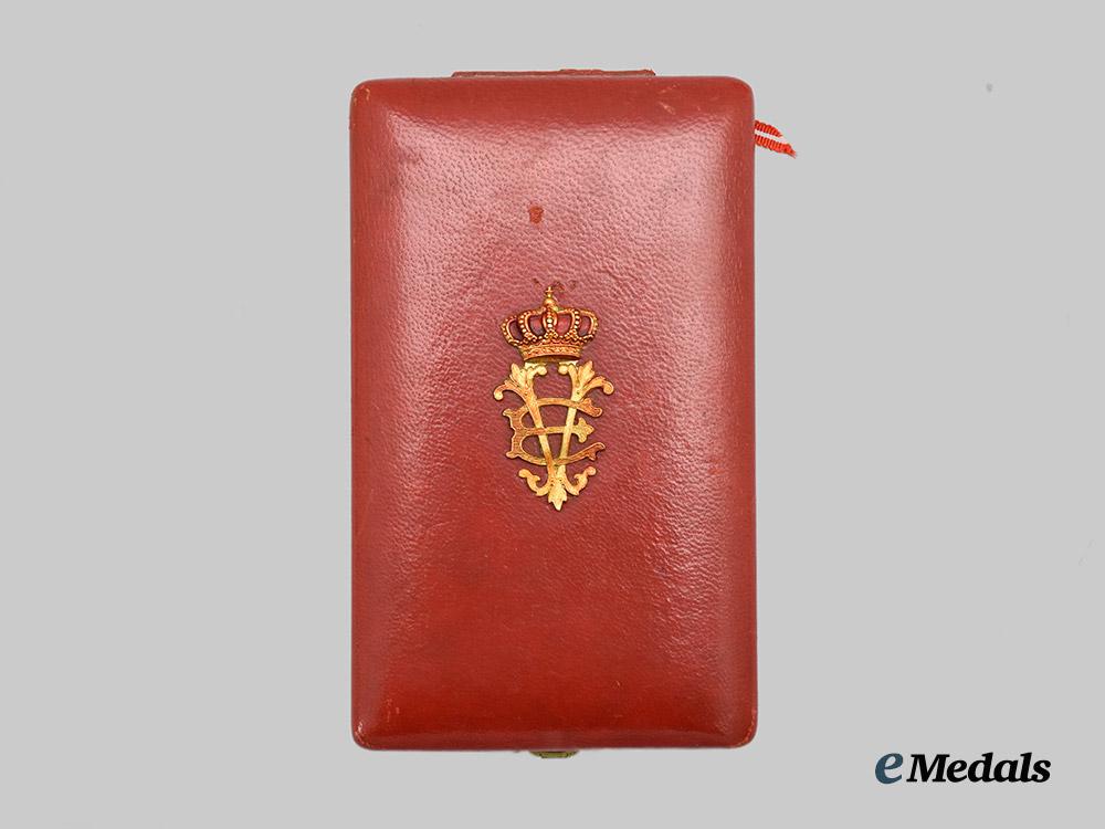 (Ordine della Corona d’Italia). Instituted February 20th, 1868. Constructed of 18kt Gold, consisting of a white-enamelled hollow construction Gold cross with Gold knots in the quadrants between the arms of the cross, the obverse with a blue enamelled centerpiece bearing a royal crown constructed of white, green, and red enamels, surrounded by a Gold ring, the reverse features a Gold central medallion bearing a black enamelled eagle with a red and white enamelled shield on its chest, surrounded by a matching Gold ring, suspended from a fixed loop and swivel ring suspension and accompanied by a period original ribbon, marked on the loop and integral suspension ring with a Hibou hallmark (owl) denoting French import since 1984 and a gold fineness of at least 750, measuring 50.6 mm (w) x 53.6 mm (h), weighing 15.0 grams, enamels intact, in extremely fine condition.