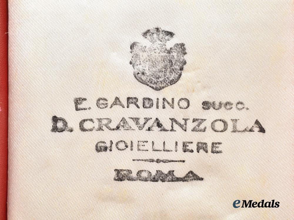 Accompanied by its original case of issue, constructed of a lightweight wooden core, with a lightly textured faux red leather exterior, the exterior of the lid decorated with an impressed gilded crowned Royal Cypher of Victor Emmanuel, the interior of the lid lined with creme coloured padded silk, with a black velvet recessed medal bed with compartment for ribbon, with a functional exterior metal hinge, intact interior fabric hinge cover, and functional exterior metal clasp closure, marked E. GARDINO SUCC. D. CRAVANZOLA GIOIELLIERE ROMA, measures 85 mm (w) x 135 mm (l) x 20 mm (d), light wear on exterior, remains in very fine condition.