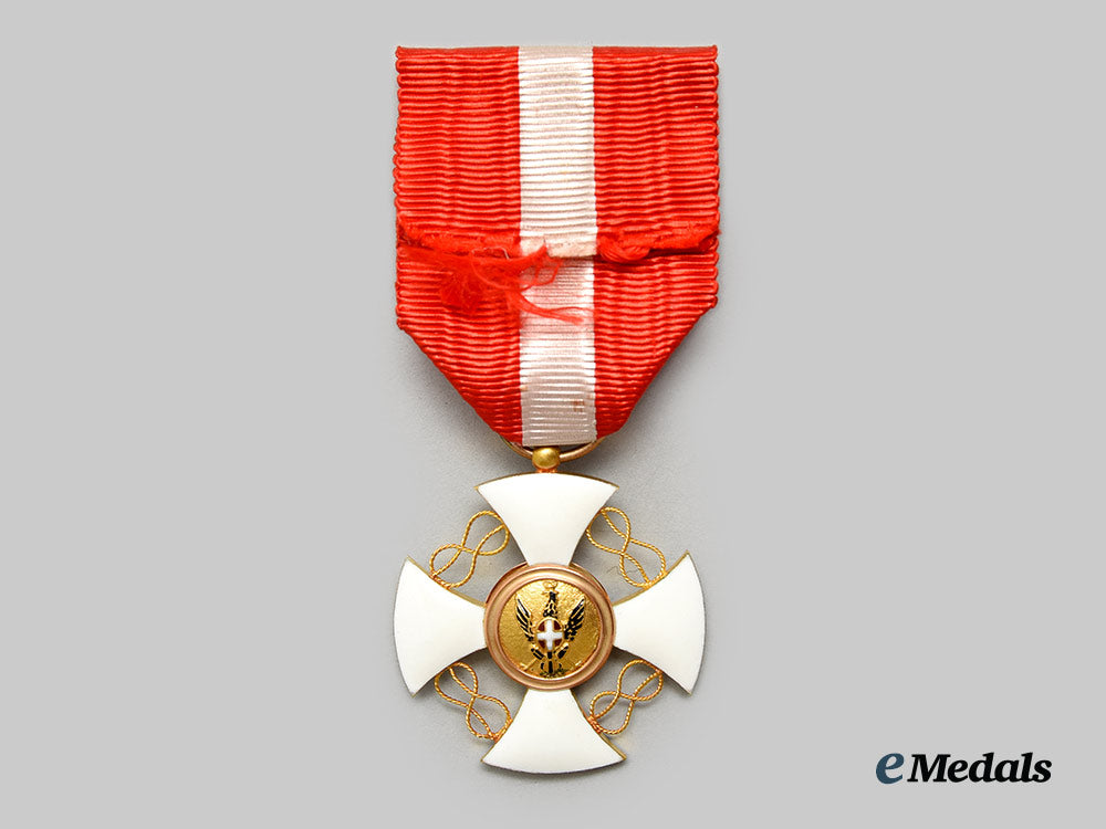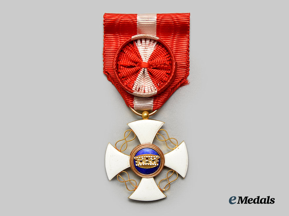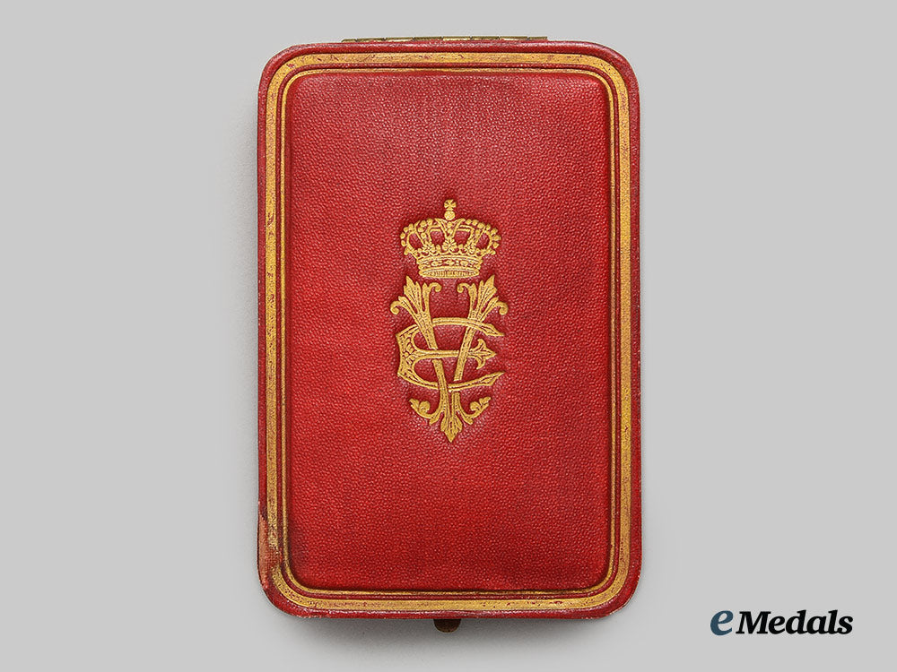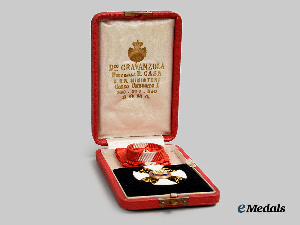 (Ordine della Corona d'Italia). Instituted in 1868. Multi-piece construction, in 18K Gold with red, white, blue and black enamels, weighing 9.6 grams, unmarked, measuring 37.3 mm (w) x 40.7 mm (h) inclusive of its laterally-pierced ball suspension, intact enamels, large rosette sewn in place to its original ribbon, extremely fine. In its hardshelled case of issue, red pebbled exterior on five sides, black pebbled bottom, crowned cypher of King Victor Emmanuel III on the lid, inside lid lined in white satin, padded and maker marked "Dco CRAVANZOLA PROV. DELLA R. CASA E R.R. MINISTERI CORSO. UMBERTO I 338.339.540 ROMA", white cardboard insert placed within the white satin lined base and housing a black felt recessed medal bed, measuring 68.7 mm (w) x 104.5 mm (h) x 24 mm (d), wear spot present on the lower left corner on the lid, light soiling evident on the exterior, case better than very fine.