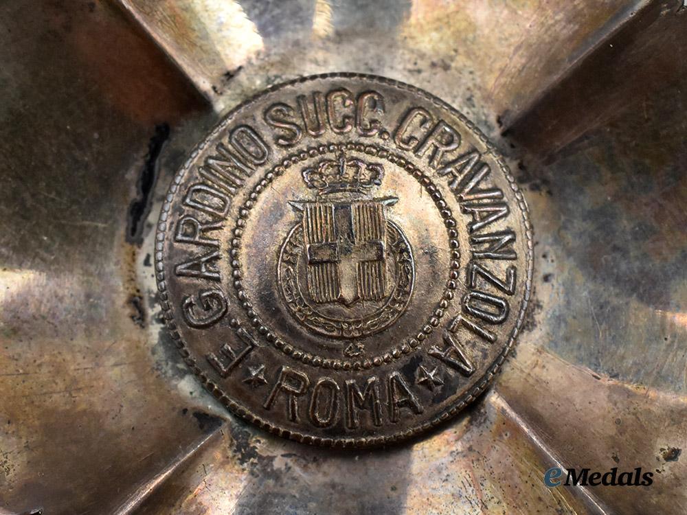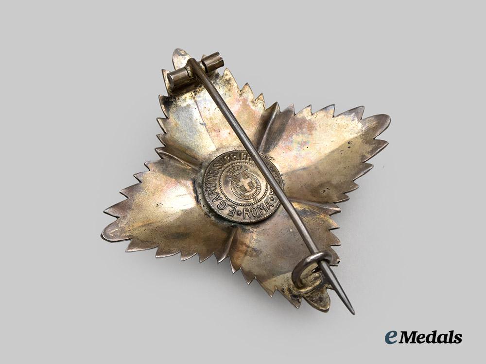 2. A breast star, constructed of gilded silver with multi-coloured enamels, the obverse consisting of a vaulted four-pointed star with pebbled arms, bearing a central white enameled Cross Pattée joined through the arms by a circular green enameled laurel wreath, with crossed swords piercing the centrepiece, bearing a central blue enameled medallion overlaid by a pre-1945 style Italian national eagle defaced by a Savoy coat of arms, the reverse with a raised barrel hinge and vertical pinback meeting a round wire catch, maker marked “E. GARDINO SUCC. CRAVANZOLA, ROMA”, measuring 72.72 mm (w) x 73.26 mm (h), weighing 46.6 grams, demonstrating some flecking and loss of finish to the enamels, in near extremely fine condition.