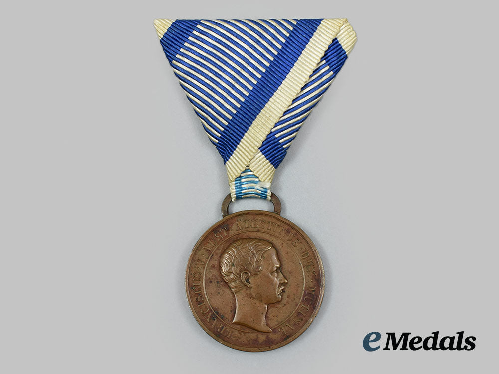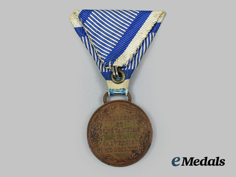 (Medaglia per i militari e funzionari, che rimasero fedeli al Duca). Instituted in 1863. In bronze, engraver marked "C. RADNITZKY" on the obverse, measuring 33 mm (w) x 38.8 mm (h) inclusive of its integral suspension, edge nicks, spotting and light contact marks overall, original triangular ribbon with hook and eye, better than very fine.