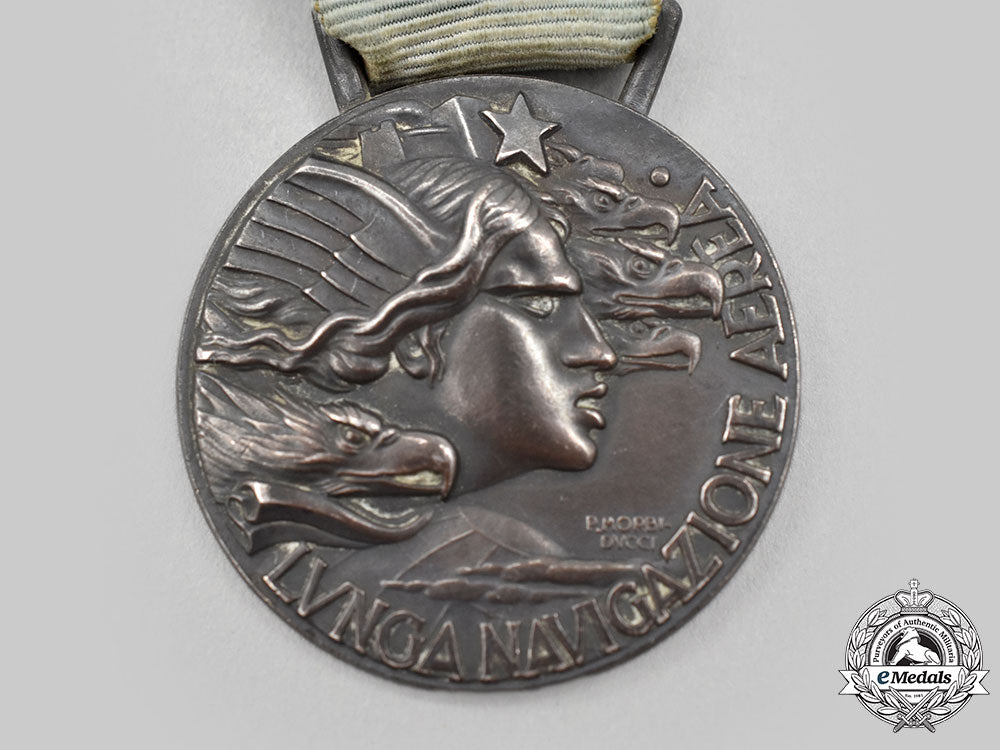 (Medaglia Militare Aeronautica di Lungi Navigazione Aerea). Instituted in 1953. In silver, engraver marked "P. MORBI - DVCCI" on the obverse, marked "986" (silver) and Royal Mint marked "Z" on the reverse, measuring 35.8 mm (w) x 41 mm (h) inclusive of its integral suspension, edge nicks, eagle clasp affixed to its original ribbon, near extremely fine.